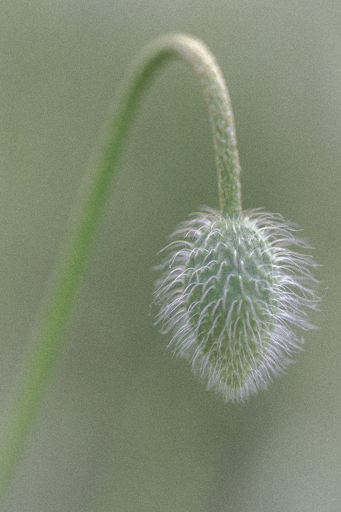 La leggera peluria del bocciolo di papavero lo fa sembrare una piccola lampada accesa.