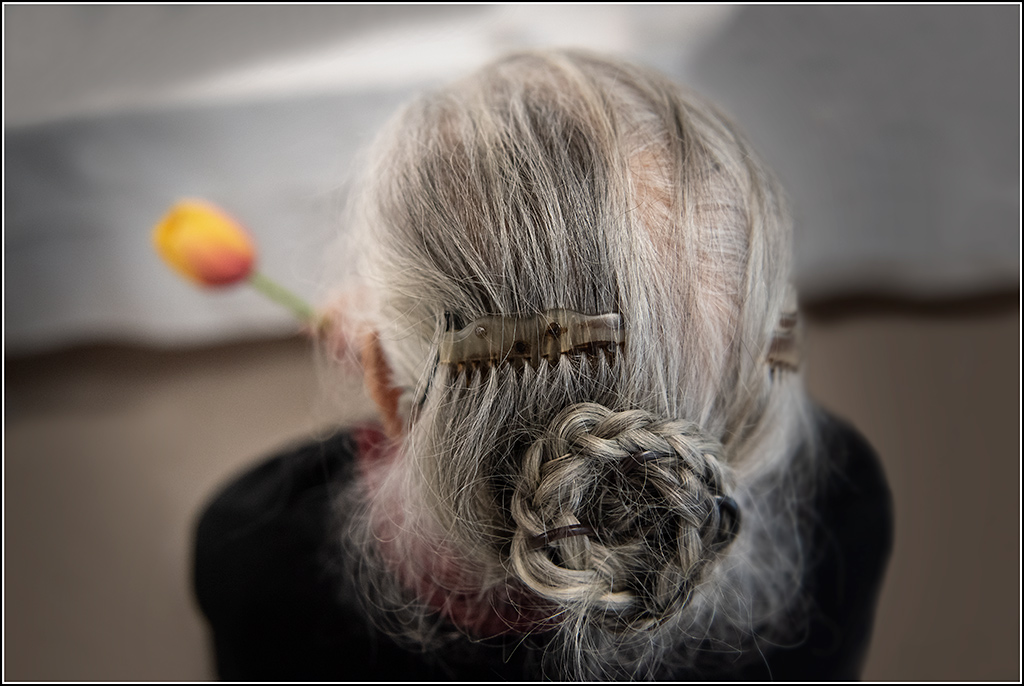 Mi era sfuggita e mi sarebbe dispiaciuto perchè è il raccontare una vecchiaia o meglio LA vecchiaia in modo carezzevole, con tanta tenerezza. Il fuoco perfetto sulla crocchia bassa ed il pettinino e su quel colore grigio/biondo 'mèschato' dal tempo và a sfumare in un altro colore ,un tulipano screziato d'arancio ,un simbolo di 90 primavere ...e non importa più quante altre ce ne saranno perchè le più importanti,quelle da tenere strette, sono quelle passate in cui ella ha 'piantato' un fiore nel cuore di chi ha amato ed è stato da lei così tanto amato...e sono 100 e sono 1000 e sono infiniti ...