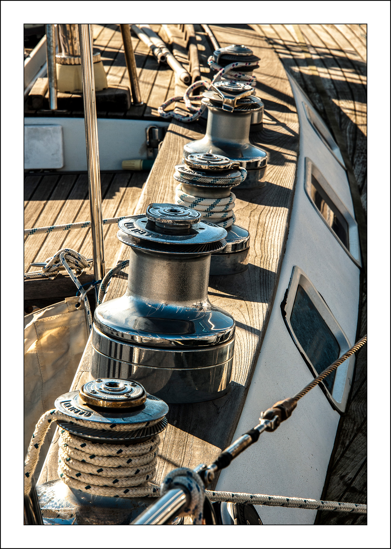 L'unico formato possibile per questa fuga di winch, l'unico che permette di seguire idealmente la bella linea dello yacht ed i suoi legni pregiati. C'è la nitidezza che accompagna i tuoi scatti e con essa una luce calda e bellissima a illuminare scotte,cime, vele e a donare il riflesso di alberi sull'acciao. 'Racconti' una lettera ma è come se raccontassi la storia di una barca e come per una straniante sensazione la foto prende vita con il pensiero che corre a quelle notti lontane di Azzurra in cui tutti imparammo a riconoscere i Grinder nel loro movimento incessante per cazzare le vle e guadagnare acqua sull'avversario,oh quel movimento così simile alle bracciate del nuoto...impossibile dimenticare.