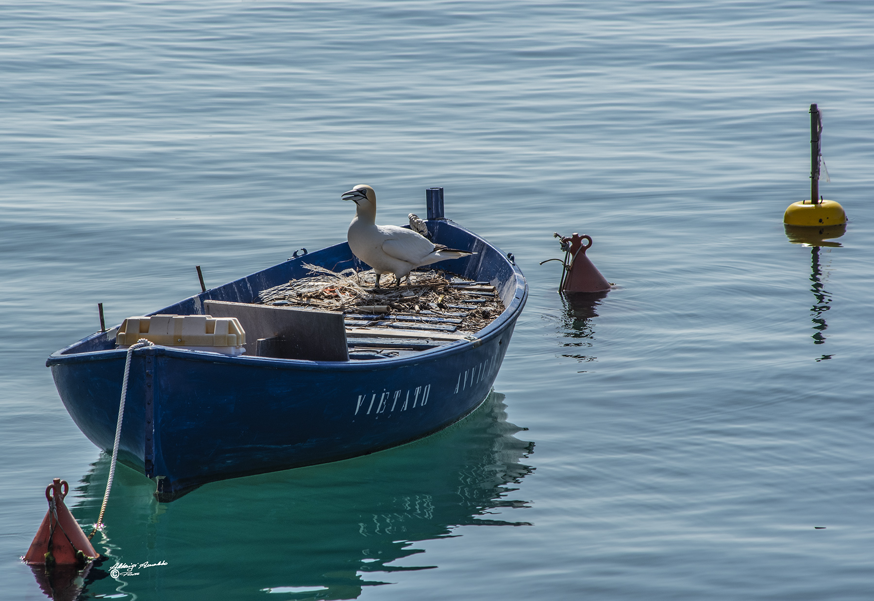 Ciao Arnaldo, immagine molto piacevole, ben composta e con belle cromie, luce dura ma controllata...un peccato per il riflesso di boa e prua della barca tagliata in basso. Il grosso uccello non è un gabbiano ma una Sula.