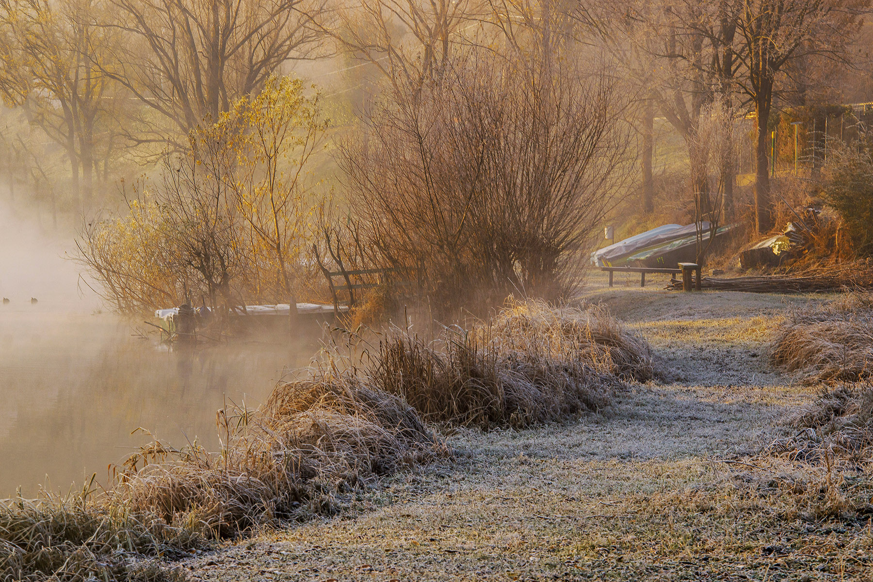 Un velo di brina ricopre la vegetazione dorata. Atmosfera ovattata come nel tuo stile