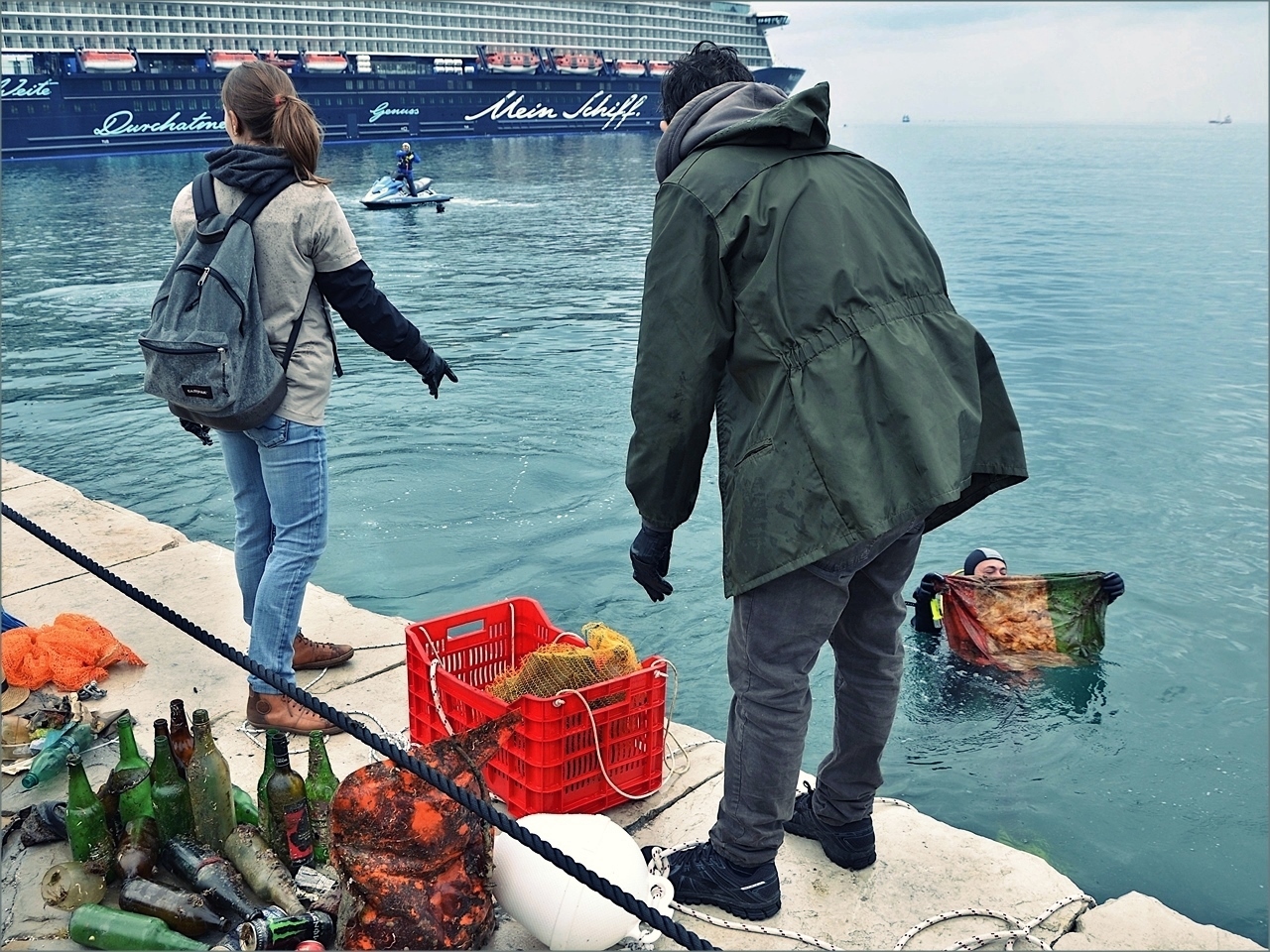 Trieste. Operazioni di pulizia del fondo marino avanti Piazza Unità d'Italia. Consigli e critiche sempre ben accetti.