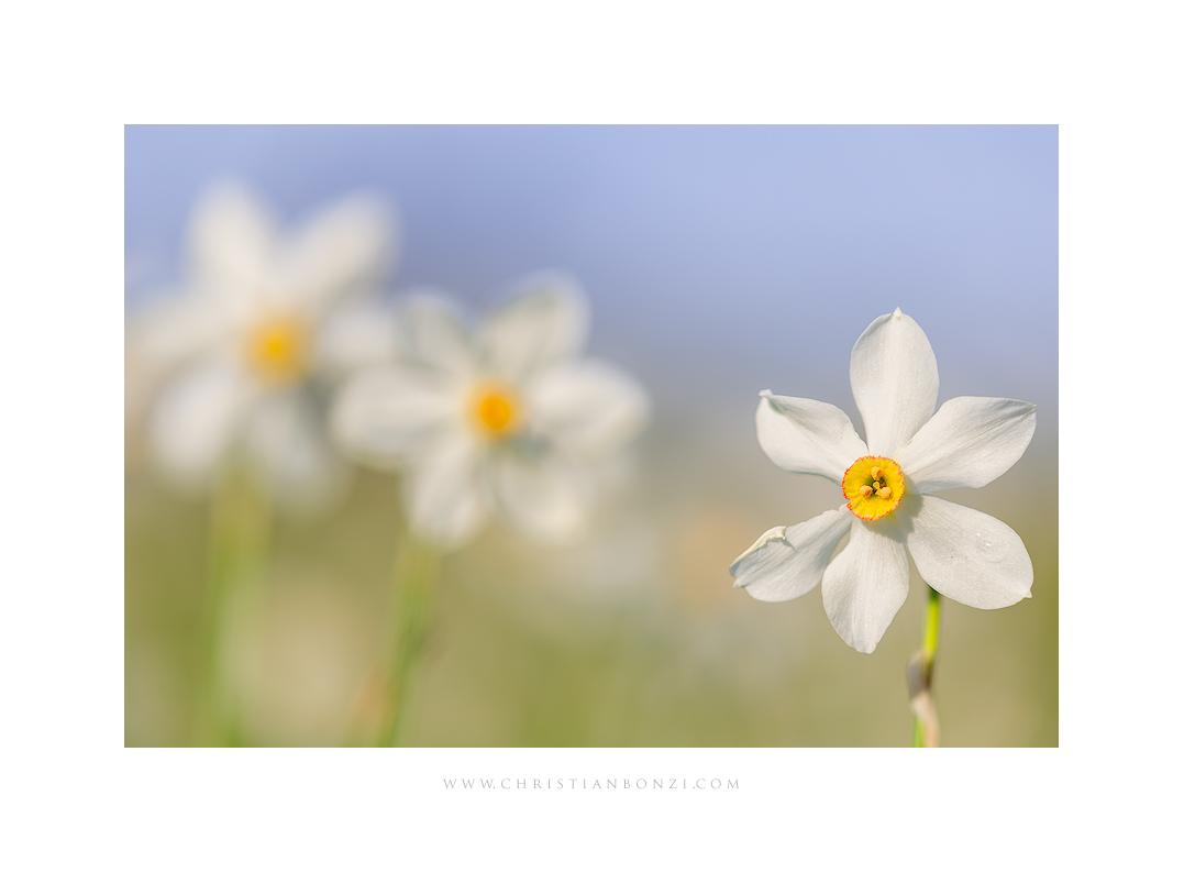 immagine delicata nei toni e nella composizione con il narciso in primo piano a fuoco che lascia intravedere gli altri che fanno da sfondo con un bel cielo azzurro, mi piace