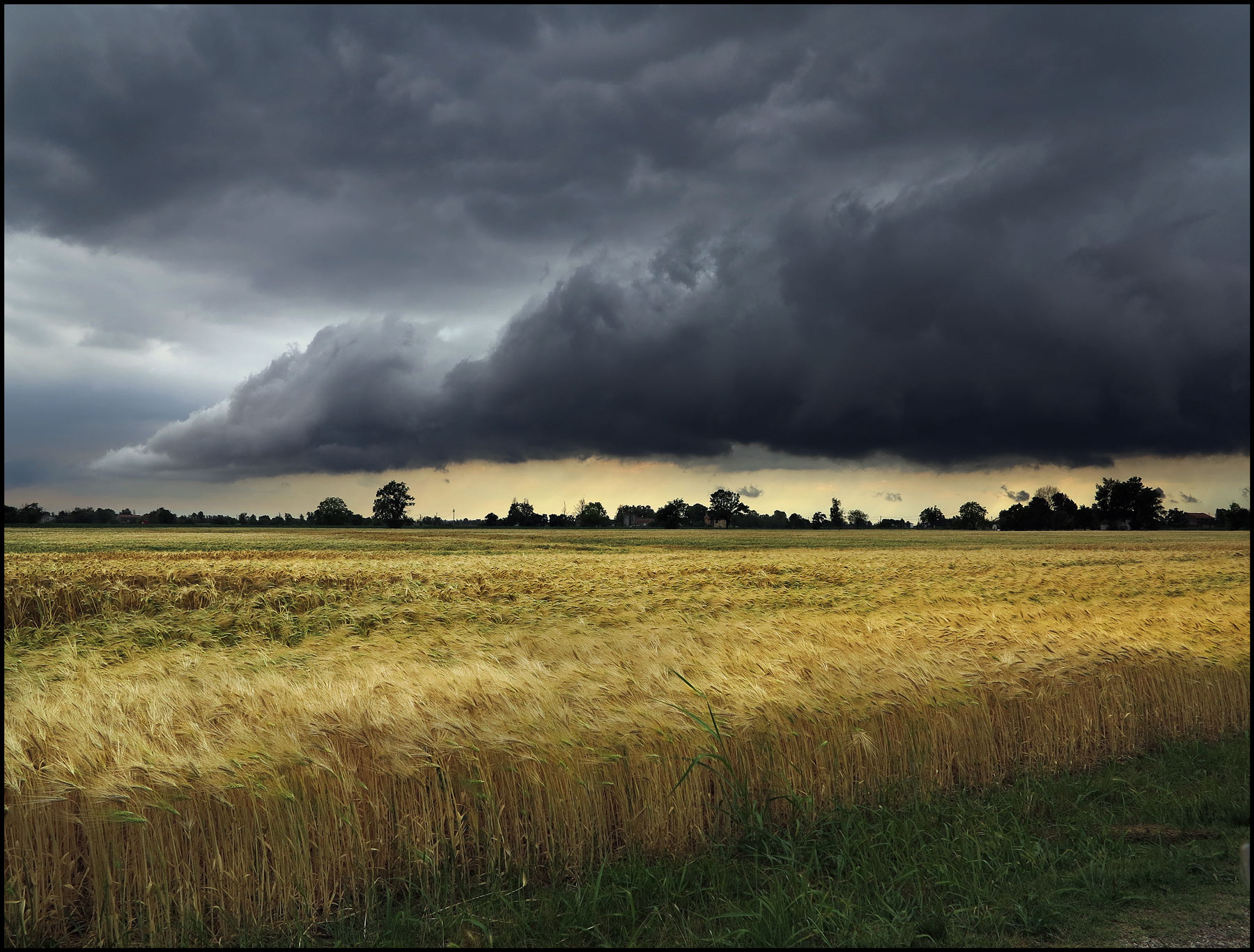 Un bellissimo scatto dove si ammira tutta la forza del temporale in arrivo..piegando le spighe di grano dando molto risalto al primo piano..molto attraenti i nuvoloni che dipinge un cielo di un grigio particolare..