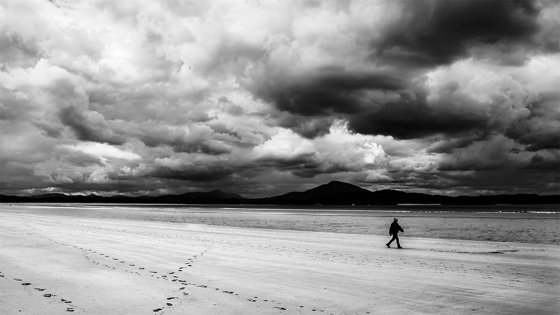 Una bella scena.. con un ottimo impianto compositivo..il giusto spazio ad un cielo potente e drammatico ma ben bilanciato dai disegni sulla sabbia,incroci di passi,di vite senza confini o destinazioni precise. Ottimo anche l'inserimento della figura umana ,Mi piace anche se io trovo la parte destra un po' troppo pesante, troppo cupa. Ciao