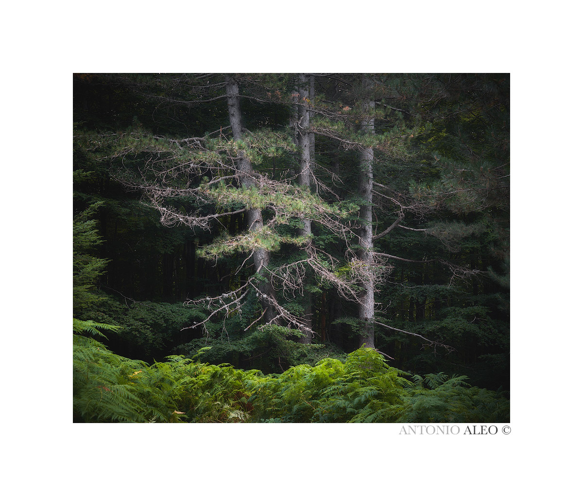 La foresta si apre nel dettaglio, in una costruzione verticale salgono i tre arbusti tra le felci, con i rami lavorati, credo, in PP per esaltare una luminosità.