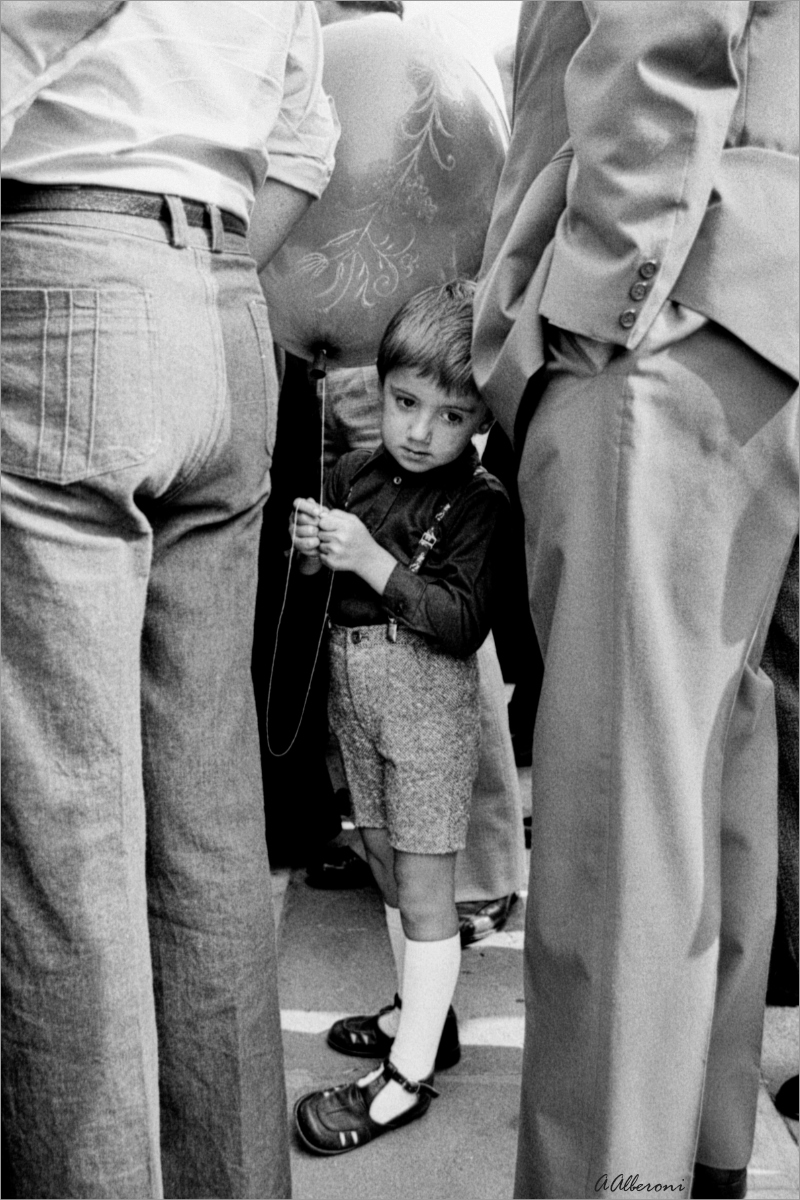 imperdibile lo sguardo annoiato del bambino "schiacciato" dagli adulti. Non riesce neppure a far volare il suo palloncino