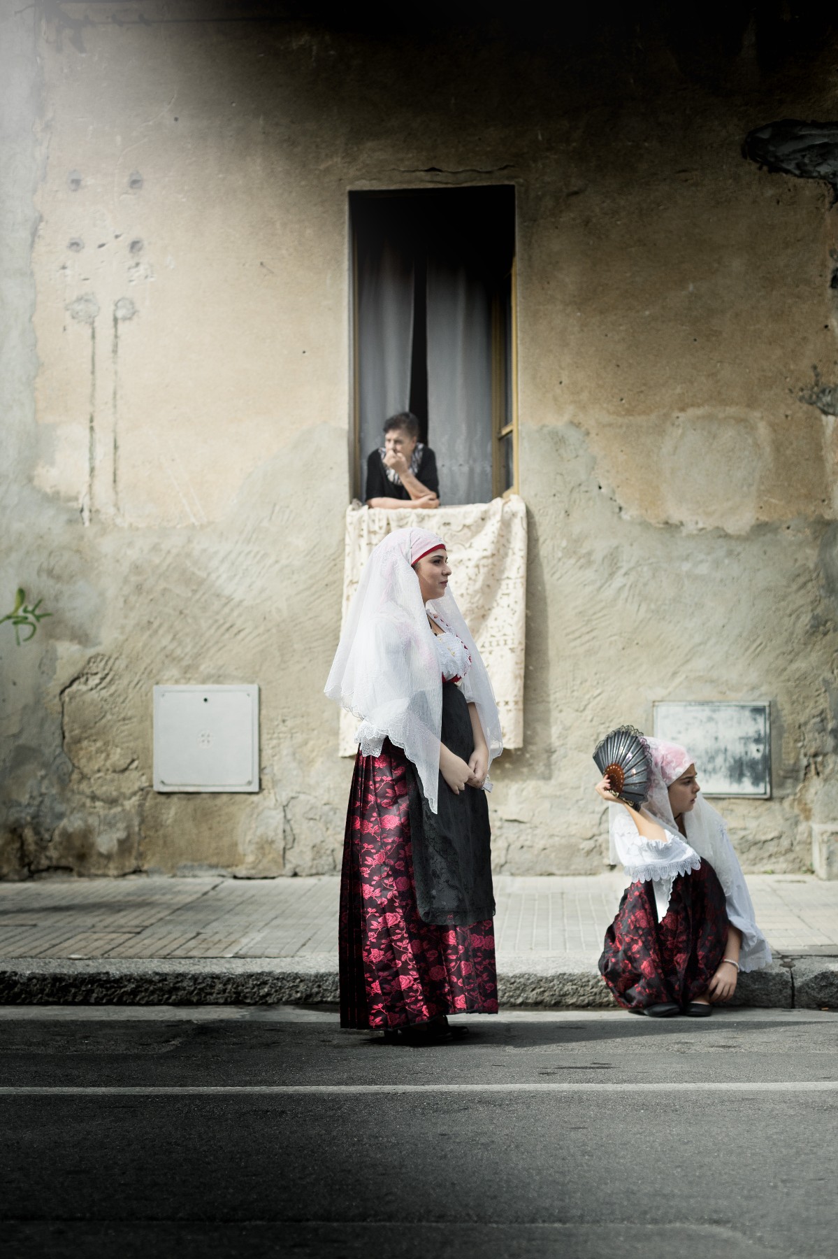 Il drappo bianco sul capo della figurante si và un pò a perdere con la sovrapposizione della tovaglia bianca dietro. Sono elementi che così accostati si rubano una bella fetta di scena a vicenda.