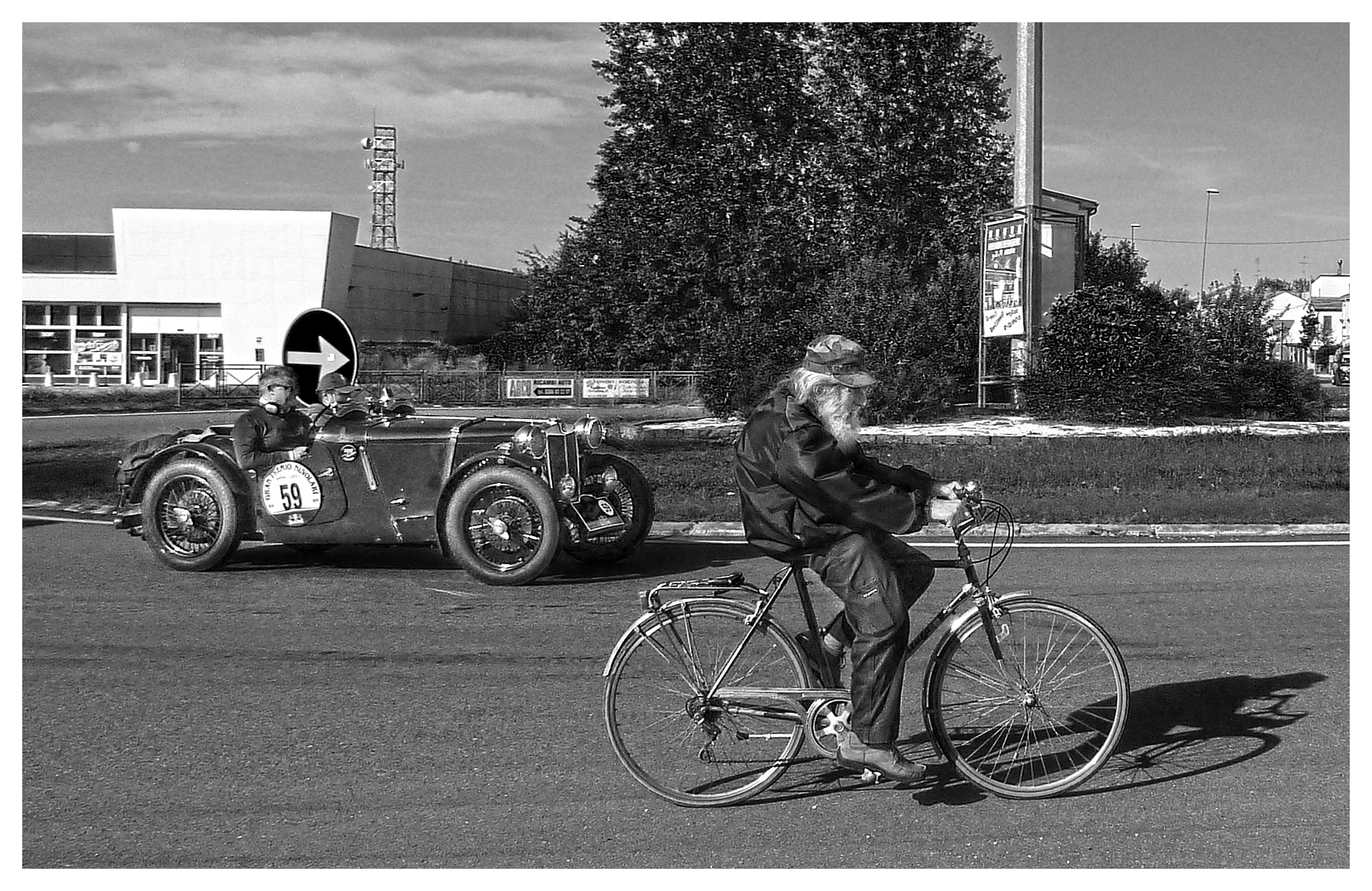 Ho spremuto (forse troppo) il file jpg lavorandolo con un leggero passaggio hdr ( da ps5 ) per ricavare un pò di incisione e schiarito selettivamente il viso del ciclista . Poi conversione in BN e qualche aggiustamento vario.