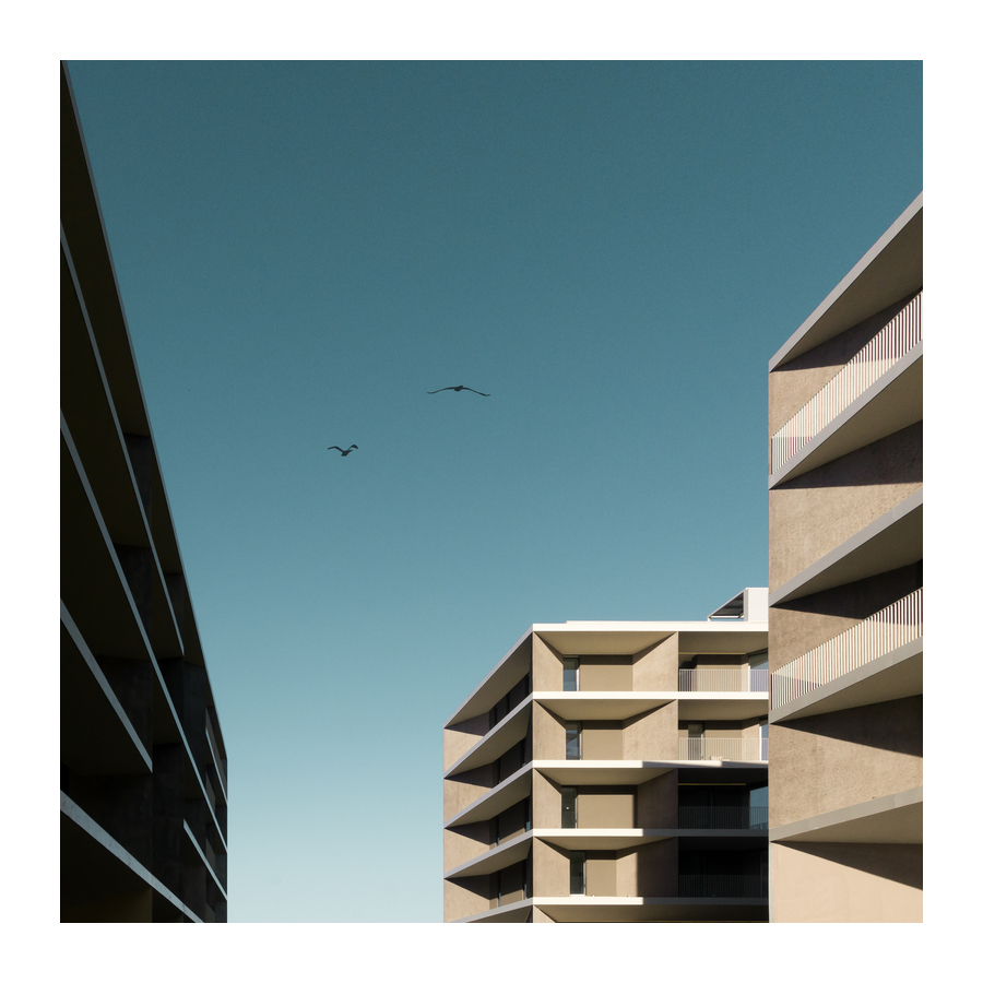 composizione essenziale e perfetta, unica presenza vivente i due gabbiani che volano nel silenzio