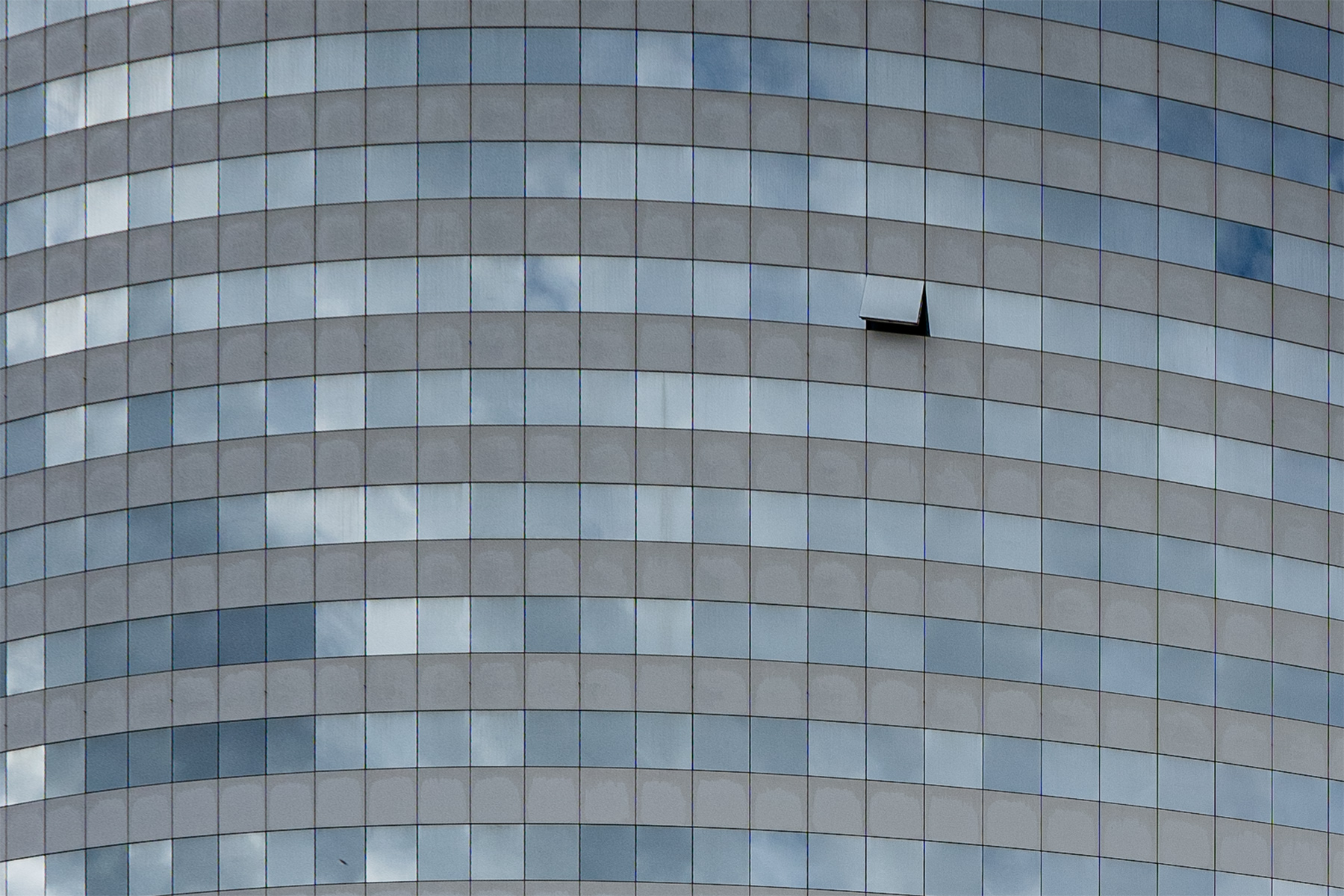 Personalmente ci vedo qualche linea e distorsione da aggiustare, dopo di che lo scatto mi piace e lo trovo indovinato con solo quella piccola finestra aperta nel cielo specchiato e ben posizionata nel frame.