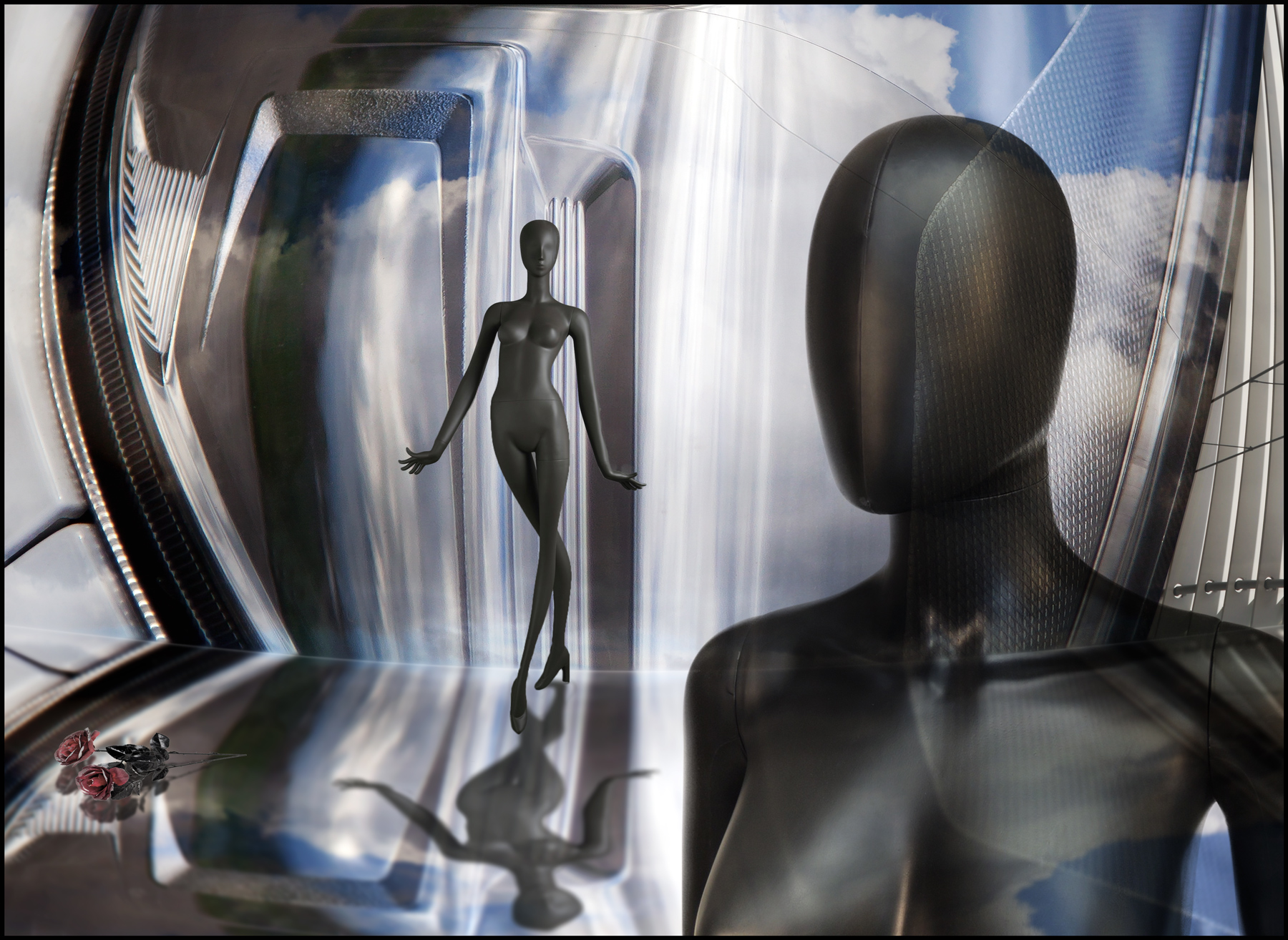 Qui lo sfondo è il fanale della mia macchina con un cielo dietro ed a fianco una porzione della stazione di Reggio...poi il tutto unito e lavorato con correzione lente per ottenere la bombatura simil fish eye. Copiato incollato e poi ricavato la base speculare. Manichini e fiori li ho trovati in cataloghi online, sono foto pubblicitarie di prodotti.