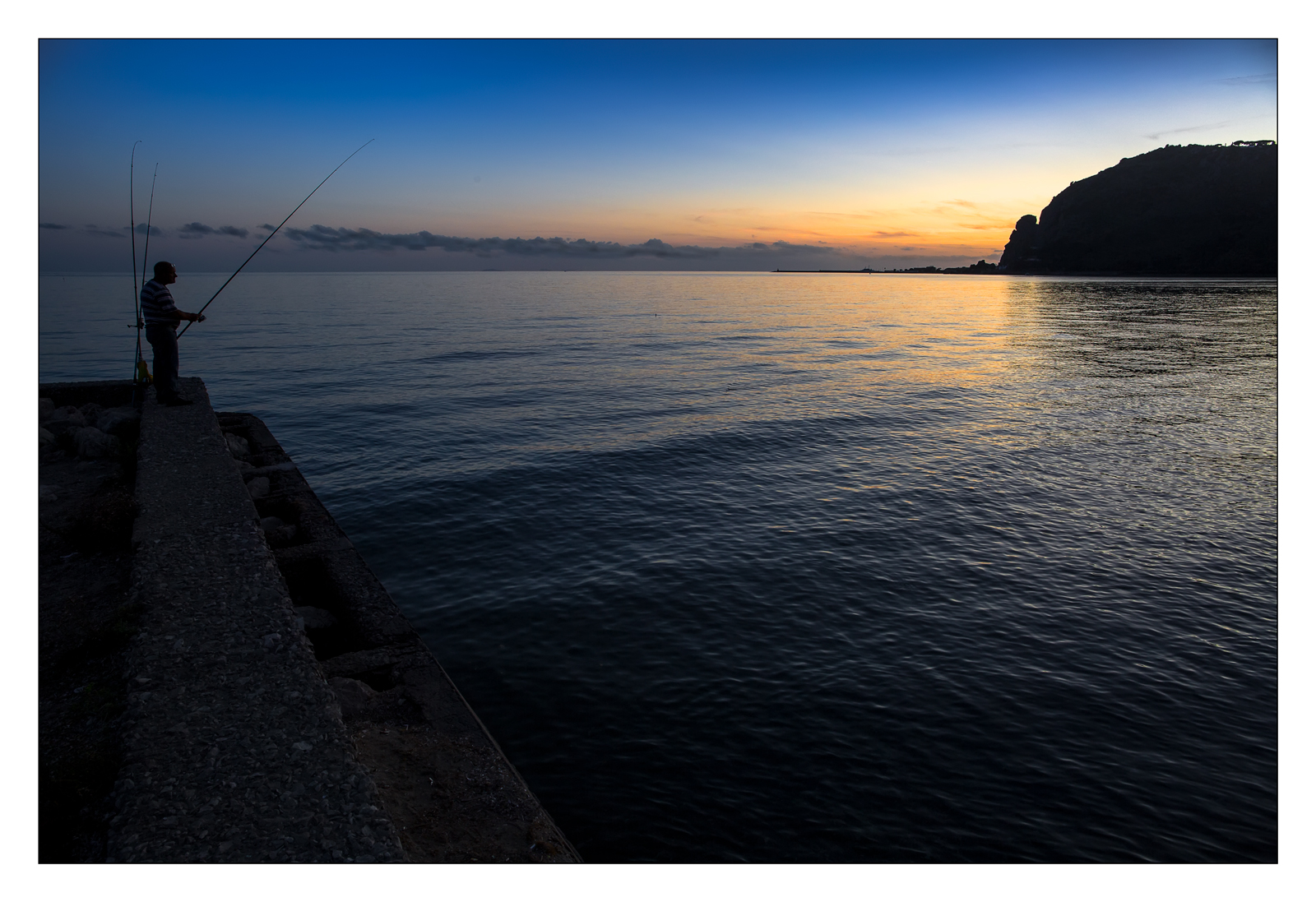 L'ora è giusta per tutti e due.. tu Marco per cogliere i migliori colori del tramonto..ed il pescatore per prendere un ottimo pesce orata o branzino va sempre bene.. Ottima proposta.