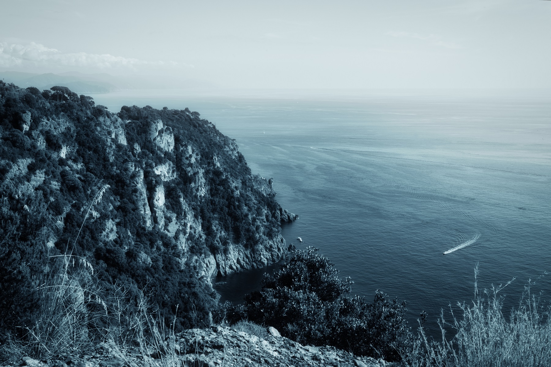 | Ho fatto questa foto durante un trekking sul sentiero verso San Fruttuoso. Mi piaceva l'idea dell'opposto, in questo caso estremo: la pace e la tranquillità (rotto solamente da un piccolo motoscafo) in contrapposizione alla sfaccettatura della roccia viva; per continuare su questa idea ho appunto scelto una monocromia non convenzionale, tentando di eliminare la “distrazione” del colore.
