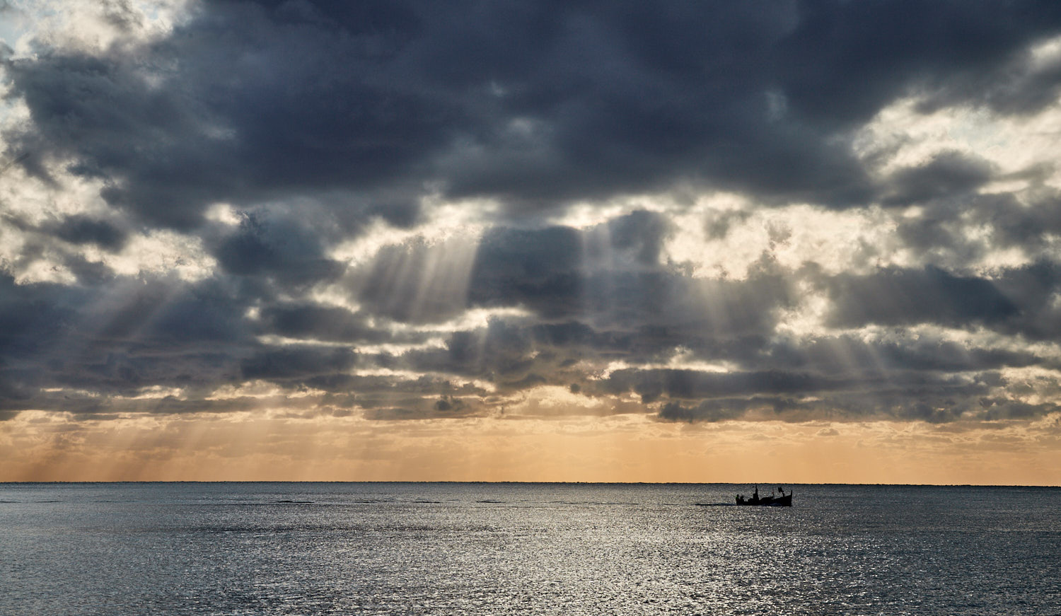 Una pioggia di raggi di luce che spezzano queste nubi a tratti gonfie e minacciose, e per questa volta il peschereccio se la caverà, composizione ben fatta mi piace!