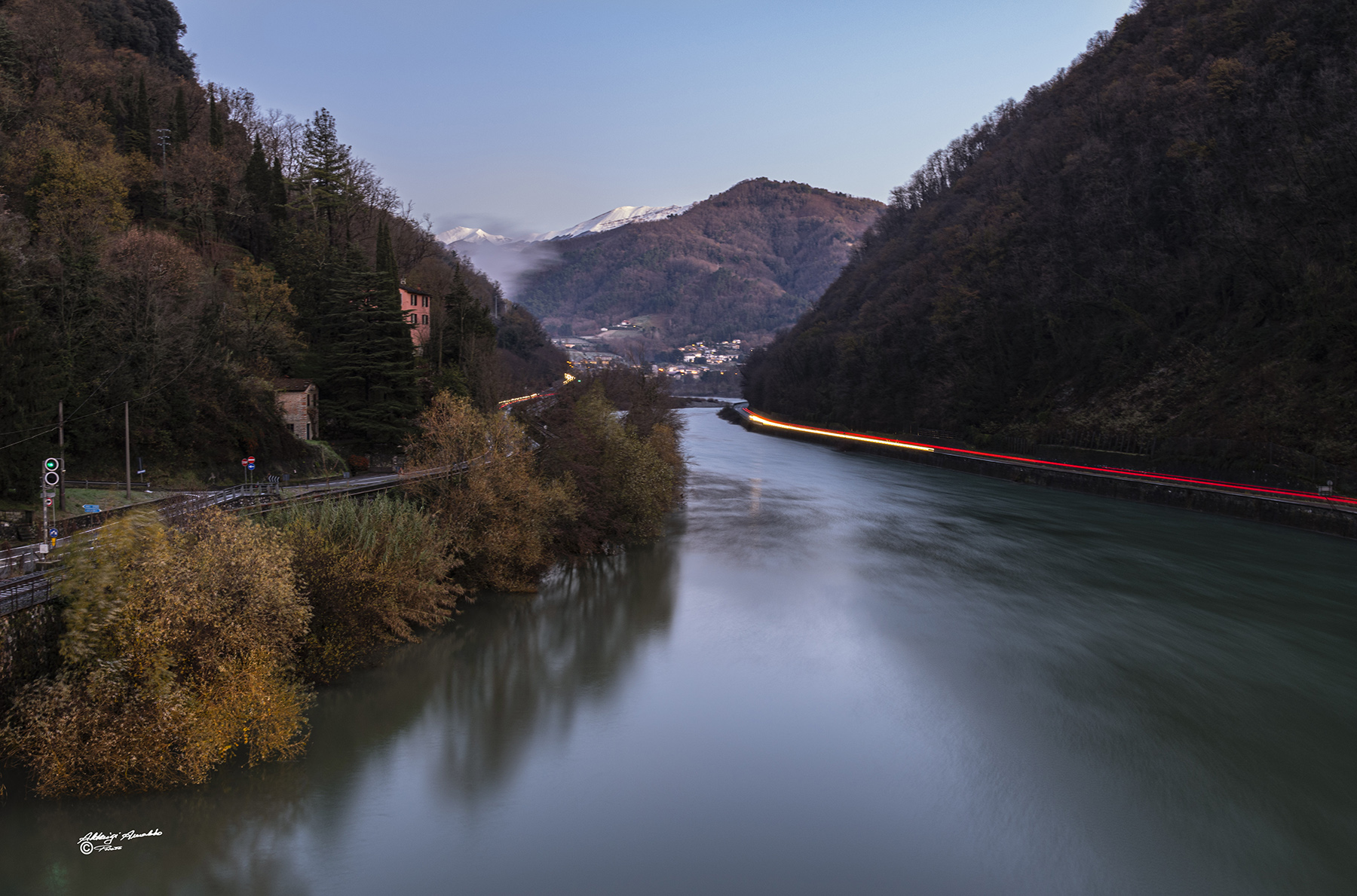Bellissimo questo scorcio di fiume,grande la profondità che ci porta fino alle vette innevate e molto suggestivi i movimenti dell'acqua e le scie delle auto. Complimenti e preferita. Buon fine settimana,Sergio.