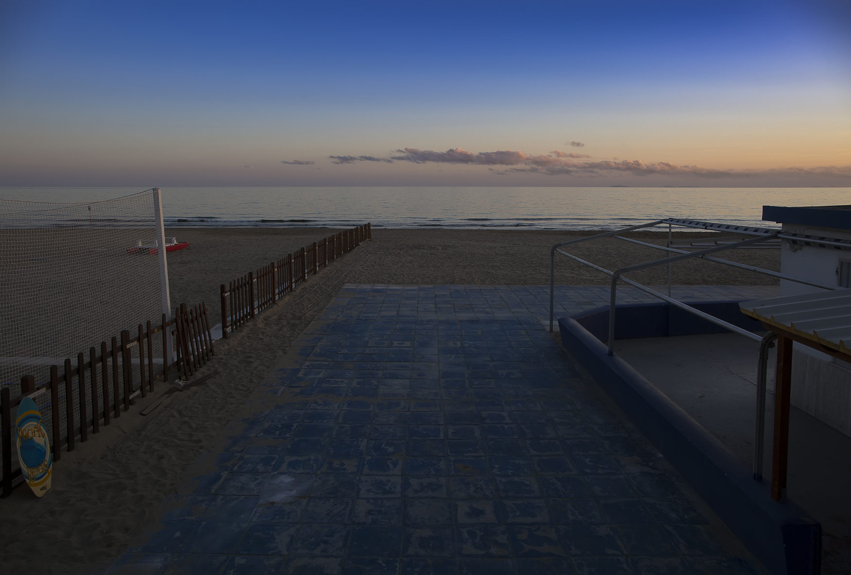 spiaggia deserta, strutture a riposo e toni freddi appena riscaldati dalla luce dell'alba, un'immagine in cui c'è tutta l'atmosfera del mare d'inverno. Bella!