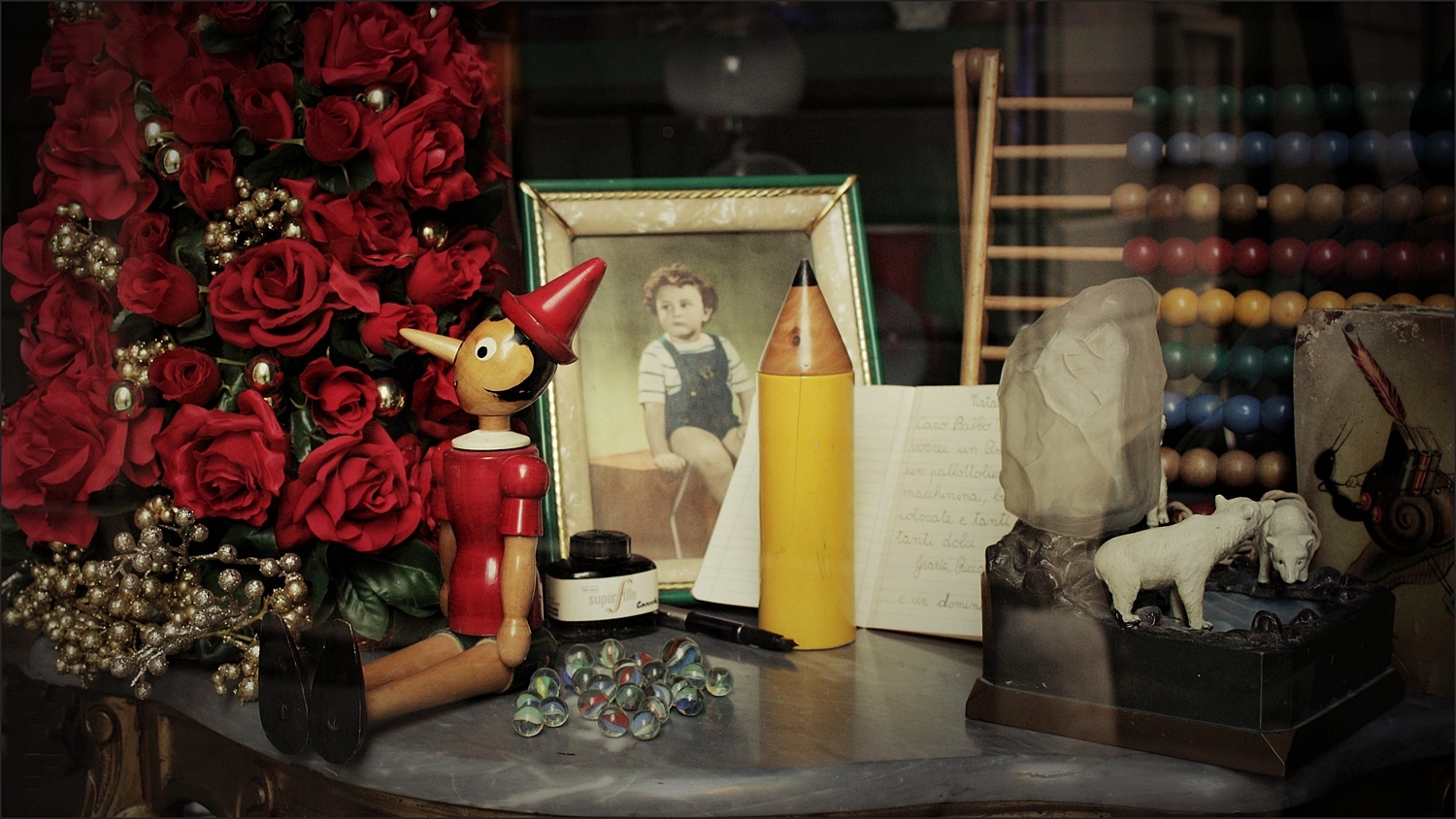 Pur nella sua ricchezza di oggetti, la foto non è pesante e colpisce perchè quel piccolo bimbo, che dirige lo sguardo verso Pinocchio, costituisce il perno attorno al quale si compone il resto.