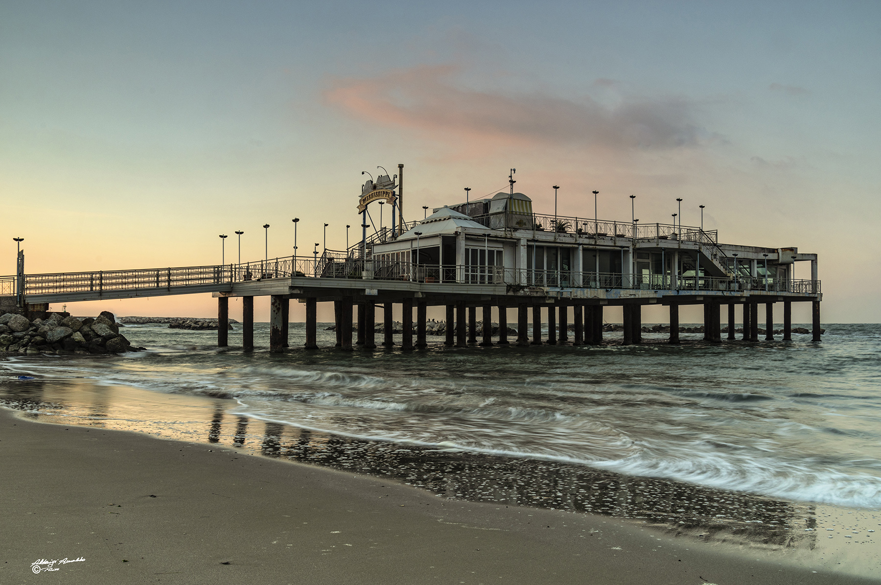 Il Mississippi, storico locale in mezzo al mare lungo il litorale di Gabicce mare PU. Il locale, edificato nel 1959 su palafitte e meta del jet set negli anni ’60 e ’70, versa oggi in avanzato stato di degrado. Si dice Entro il 2021 Gabicce Mare riavrà il Mississippi.