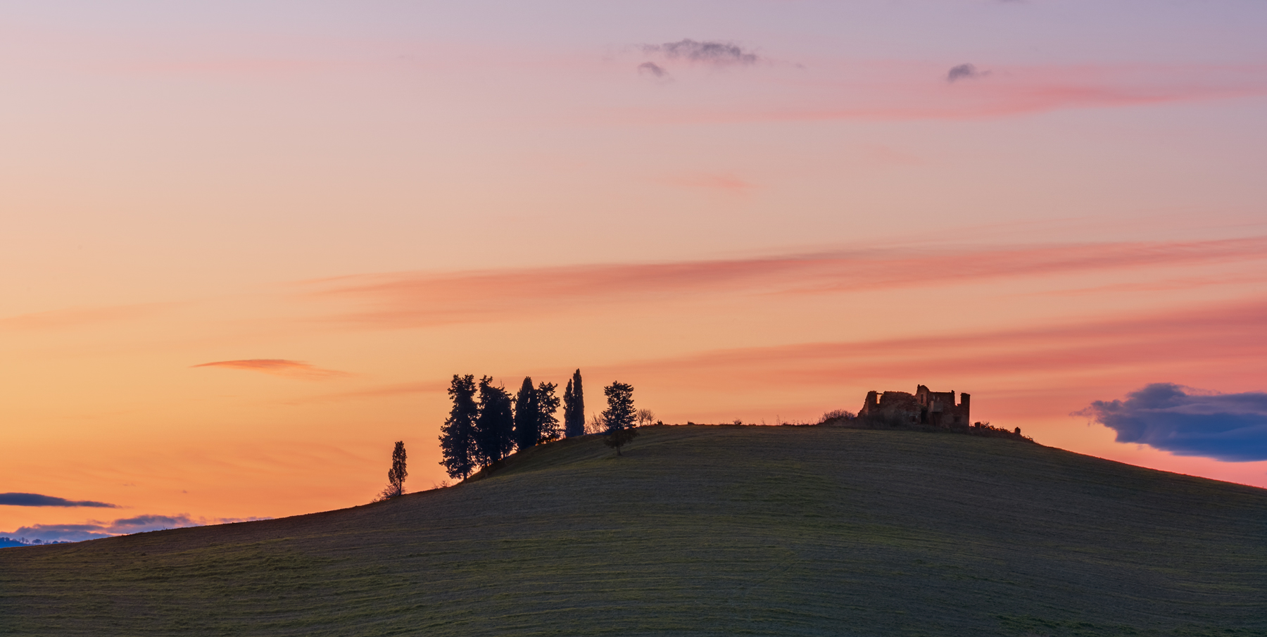 Adoro questi scorci collinari, pochi elementi che si stagliano su un cielo variopinto.