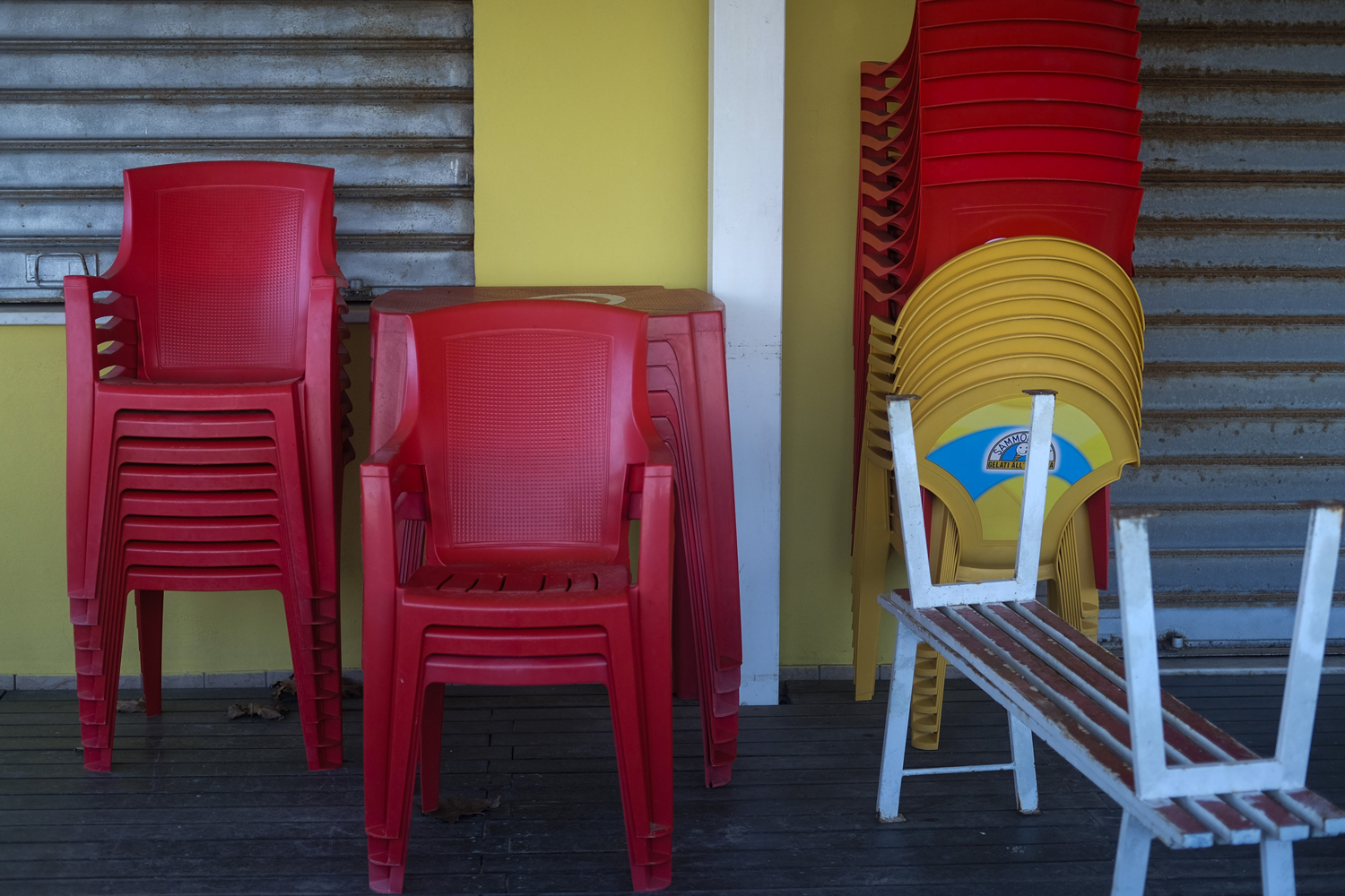 ciao ci sono contrasti di colore molto decisi e simmetrie con lo sfondo muro saracinesca , mi richiama ad un qualcosa tipo fine stagione estiva o un qualcosa del genere ...mi piace  |