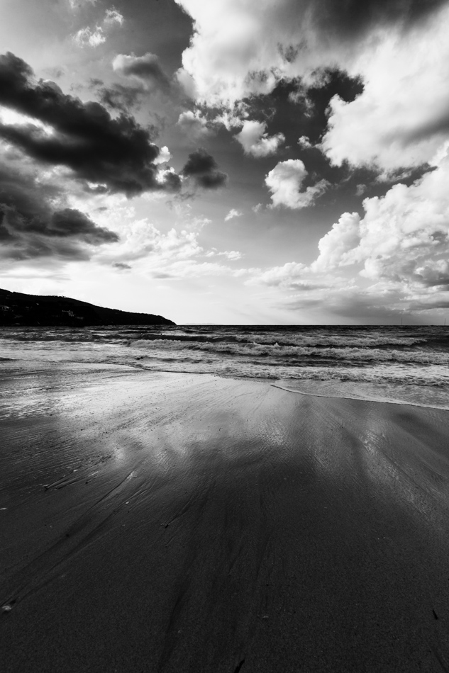 Bel b/n. Luce, posizione delle nubi, complice il riflesso sulla battigia, rendono la scena quasi dinamica.