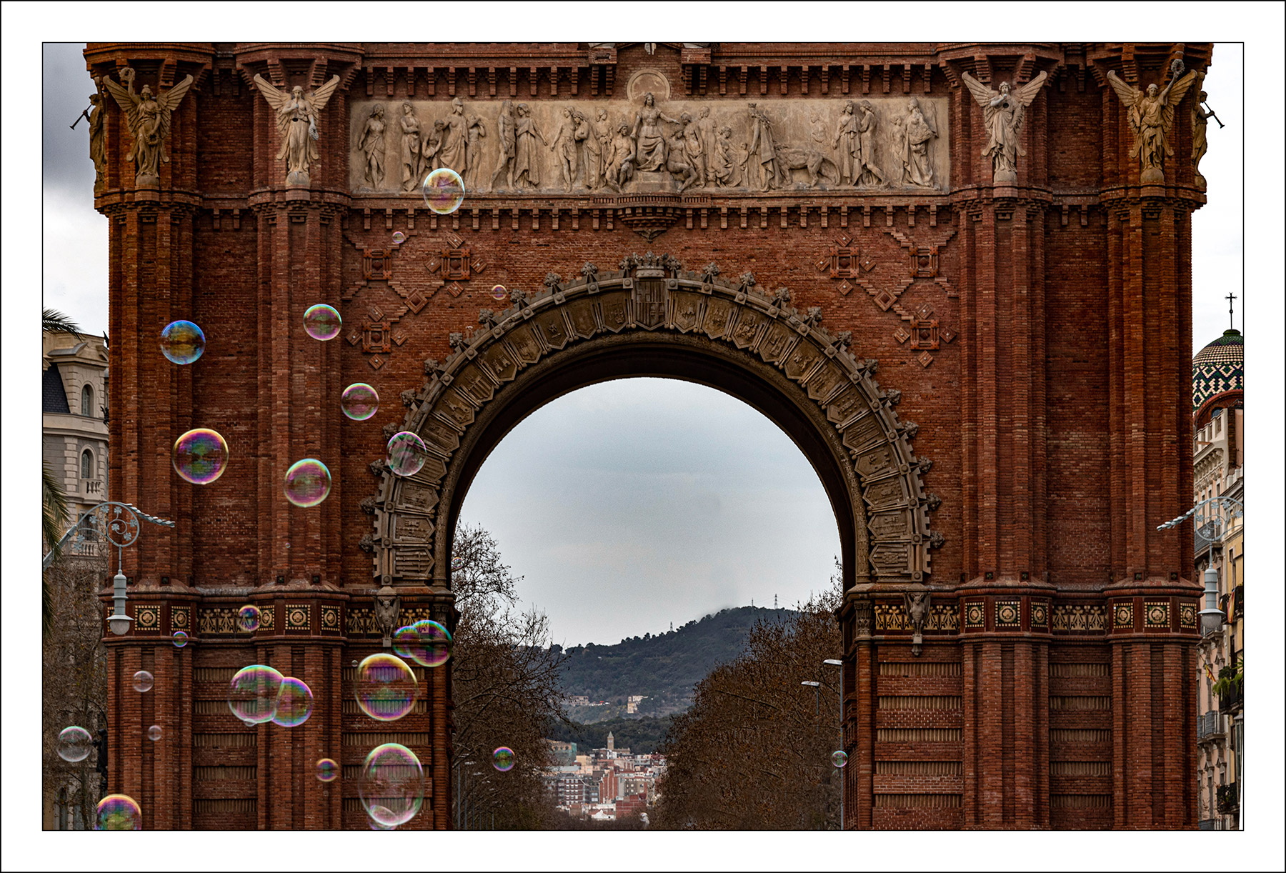 | L'Arc de Triomf è una costruzione in mattoni datata 1888 ed eretta in occasione dell'Esposizione Universale di quell'anno. A differenza di altri archi di trionfo che celebravano vittorie militari, l'Arc de Triomf di Barcellona ha un carattere civile in quanto celebra il progresso artistico, scientifico ed economico. Nella parte interiore dell'arco è possibile vedere gli scudi delle 49 province spagnole, alla base di quell'arco si notano anche i due grandi pipistrelli ad ali serrate e un terzo in alto sopra la Corona Aragonese, così anche sull'altra facciata. |