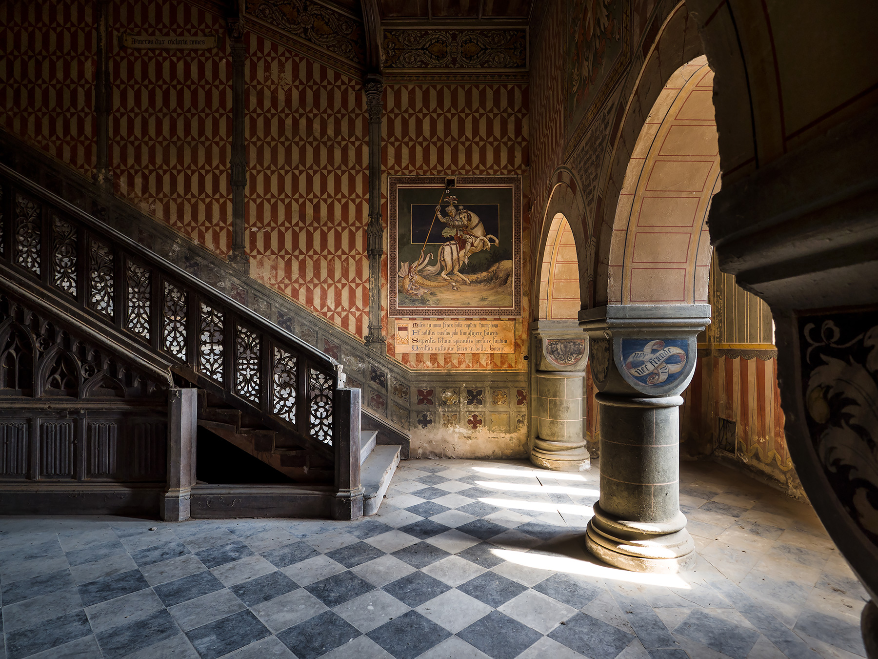 molto bella la luce che entra dalle finestre e illumina i colori caldi delle pareti e delle colonne, in contrasto con il b/n del pavimento. Ottima immagine