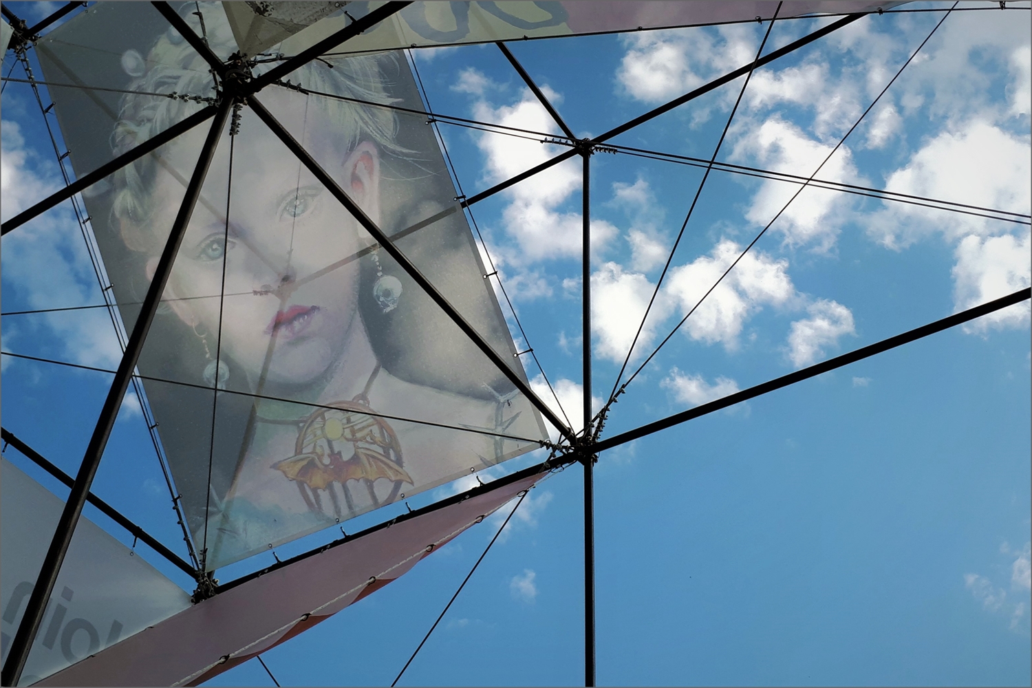 | Una bambina con teschi come orecchini ed un medaglione con un pipistrello , incastonata in una struttura che la imbriglia....un trattenerla nel materico separandola dal cielo...... senza confini e riferimenti. Immagine eloquente ( in base alla mia opinabile lettura ) realizzata molto bene. |