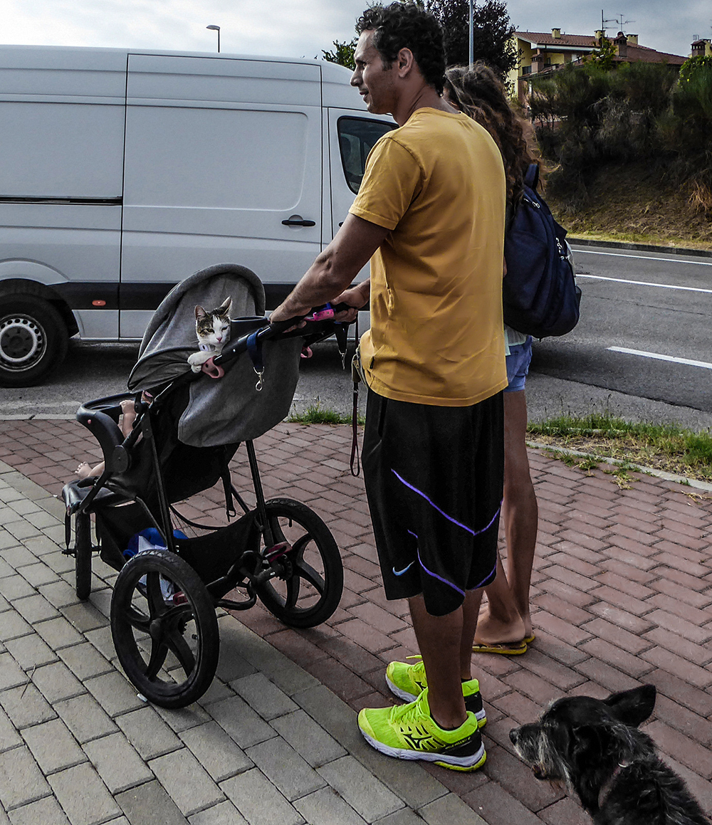 Fosse mia avrei tagliato le teste dei soggetti sfruttando per intero tutta la diagonale \ gatto pantoloncini cane, che è la cosa interessante da guardare