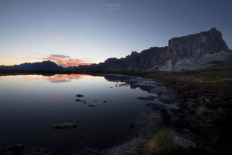| chiaramente è voluto per evitare di distogliere il percorso che l'occhio dovrebbe fare partendo dal basso per finire sull'alba. le parti scure, non so se conoscete il posto, ma credo di no, non sono altro che fango calpestato da mucche al pascolo. non un gran bel vedere. Solitamente questa pozza viene utilizzata in altre angolature. la sfida è stata quella di valorizzare il piccolo gioco dei colori che stava avvenendo in un'altra direzione della scena ed il riflesso sull'acqua.