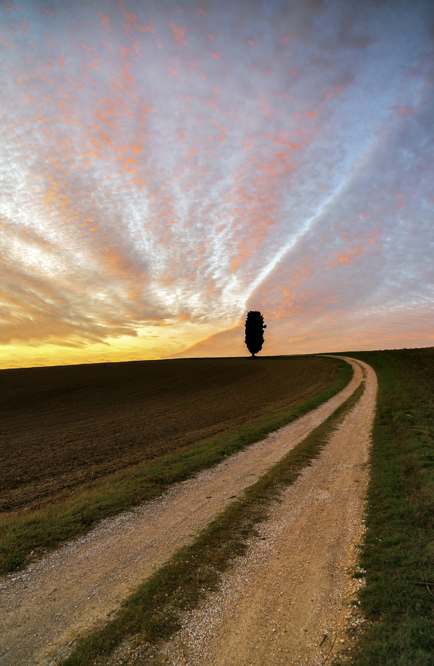 Tutto converge verso il solitario cipresso: nuvole, viottolo e , di conseguenza anche il nostro sguardo. A mio avviso molto ben composta. Nonostante l'illuminazione sia coerente, a mio gusto darei un pochettino di maggiore luminosità ai campi e un po ' meno di dominante gialla al viottolo.