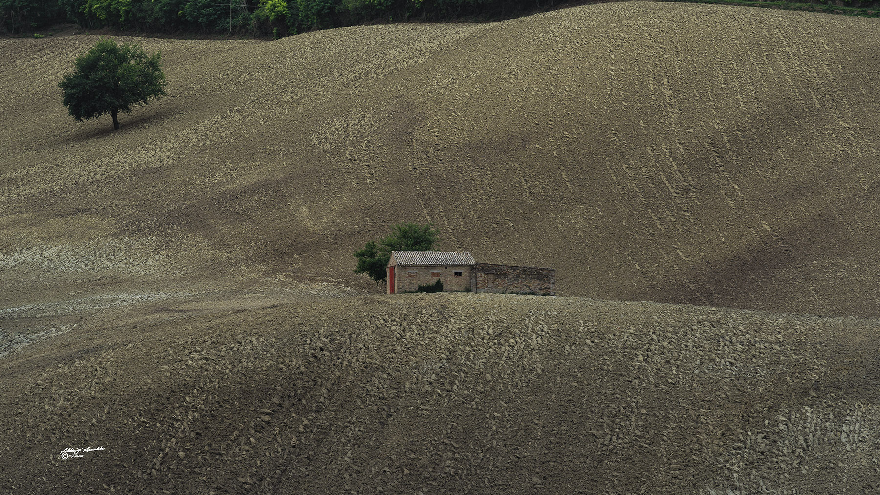Mi piacciono i colori ed i toni e la luce, mi piacciono le trame che la terra arata forma ed il loro andamento ipnotico, mi piace come il casolare e la pianta a sx in alto caratterizzano il paesaggio, non mi convince invece la cornice naturale verde in alto, ma, probabilmente non potevi fare altrimenti.
