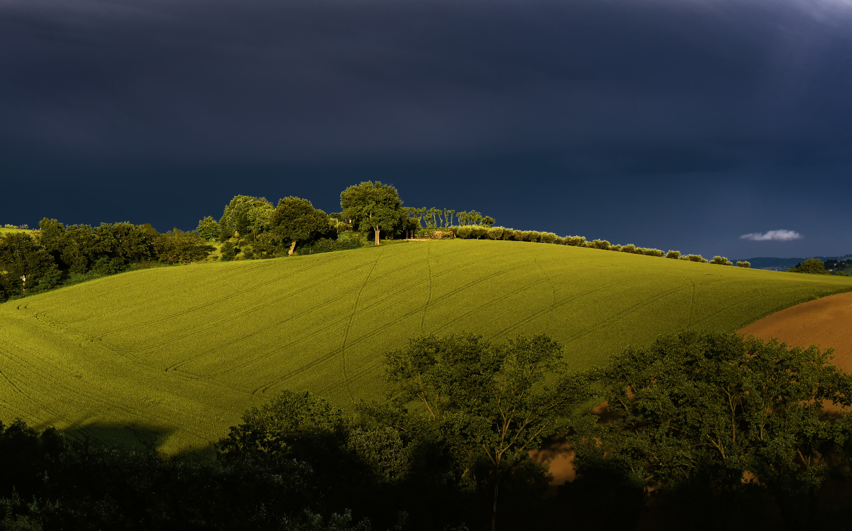 il verde brillante dei prati risalta perfettamente con un cielo così cupo, un'ottima immagine