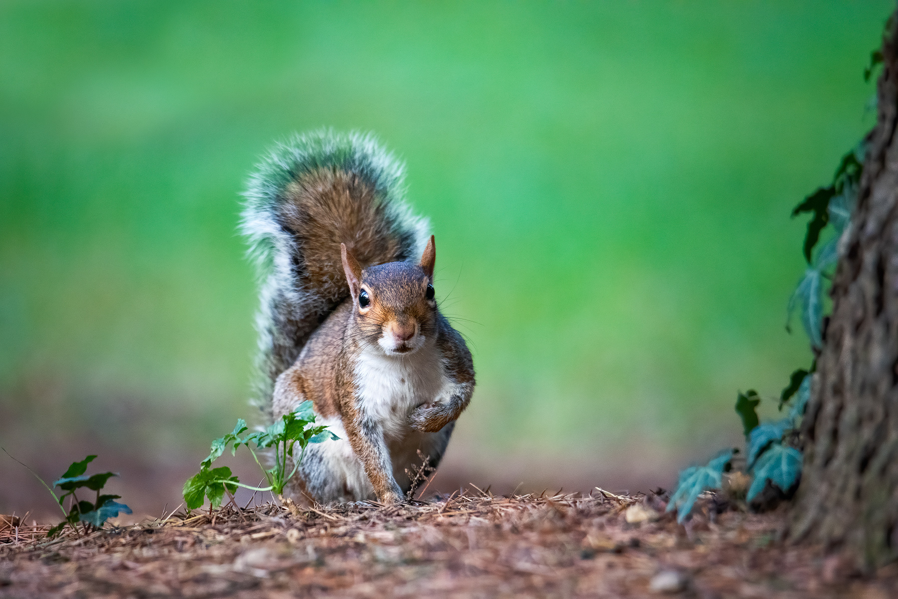 Simpatico questo scoiattolino molto ben ripreso; adorabile la zampetta alzata e soffice la coda resa ancor più morbida dallo sfocato. Bella immagine.