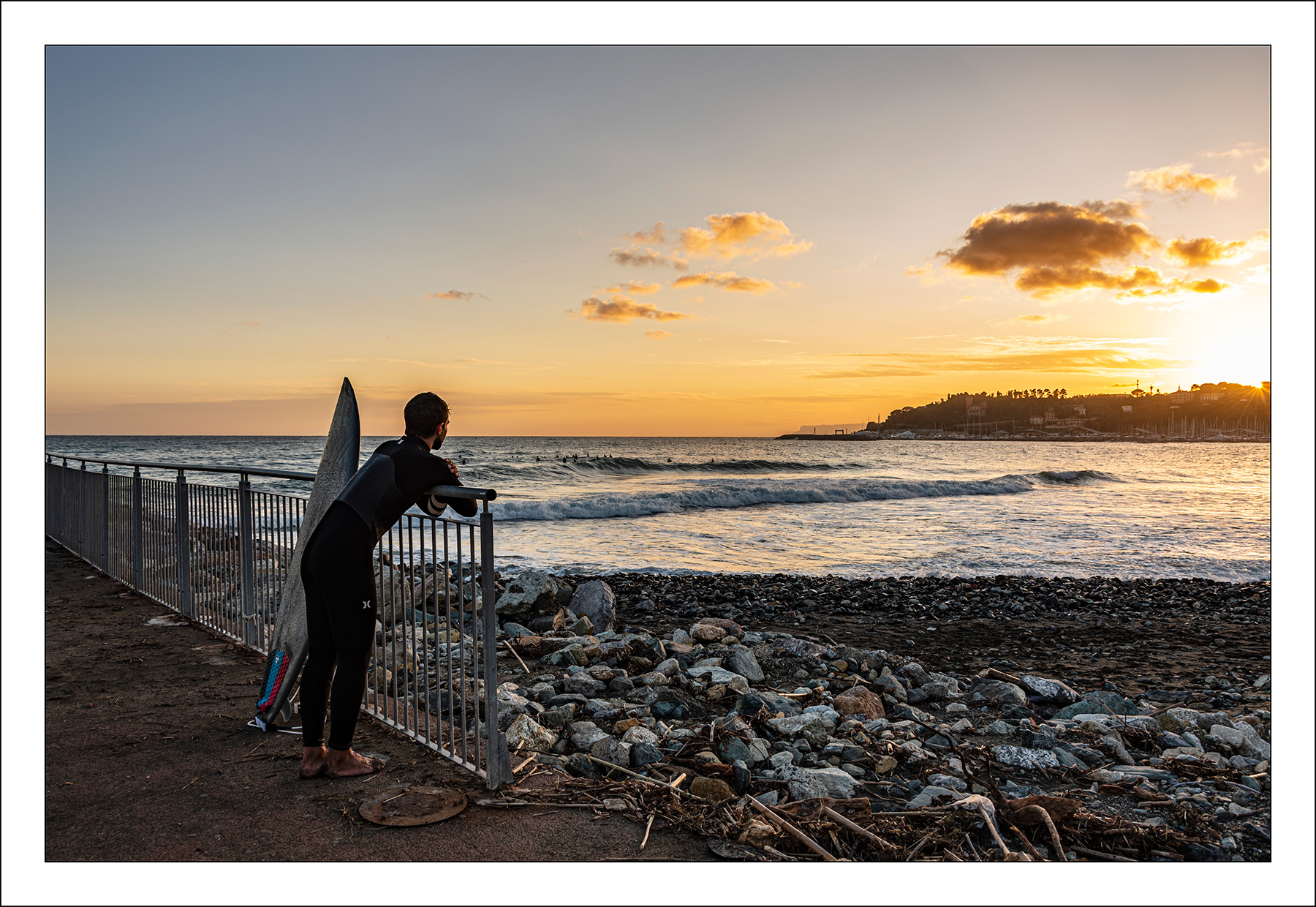 I 'cacciatori' d'onda. Coraggiosi e spiriti liberi . Credo Varazze uno degli SPOT più conosciuti d'Italia in un tramonto denso di caldissima luce invernale. Mi piace il tuo racconto della stanchezza ,uno sguardo che non vediamo ma che la perfetta composizione ci porta ad intuire rivolto ai compagni perchè anche quello è divertimento. " Ci sono un milione di modi di fare surf, e finchè lo fi sorridendo lo stai facendo bene " .Magari ne hai anche sul Point Break?