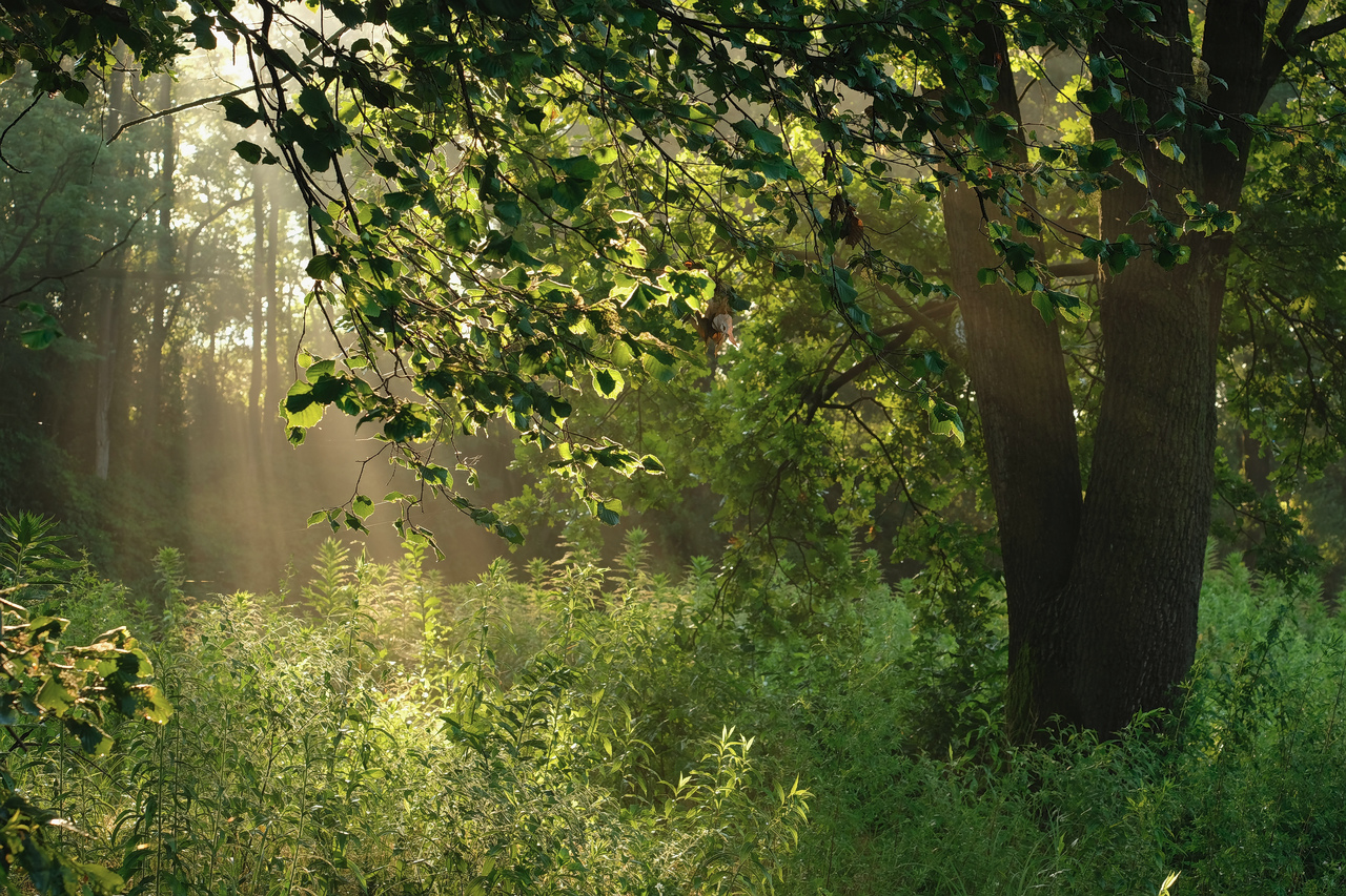 l'autunno non è ancora arrivato in questo bosco in cui si alternano i vari toni di verde illuminati dai raggi del sole che filtrano, ottima immagine