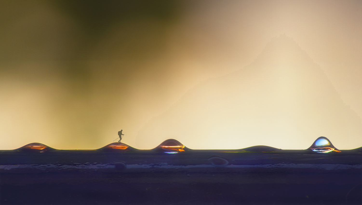 Dune composte da gocce d'acqua in uno scenario fantastico e immaginifico. Il piccolo esploratore è stupendo. Qui ci metto una stellina Ciao