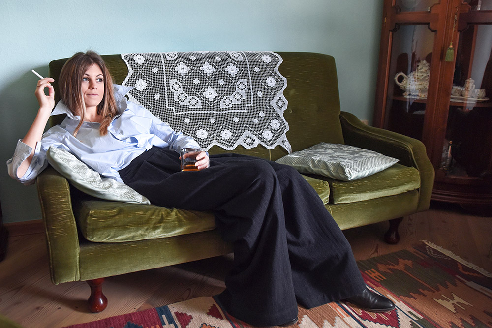 Il salotto buono e la giovane stravaccata che beve e fuma crea un bel contrasto e può suggerire storie ricorrenti di attriti generazionali.