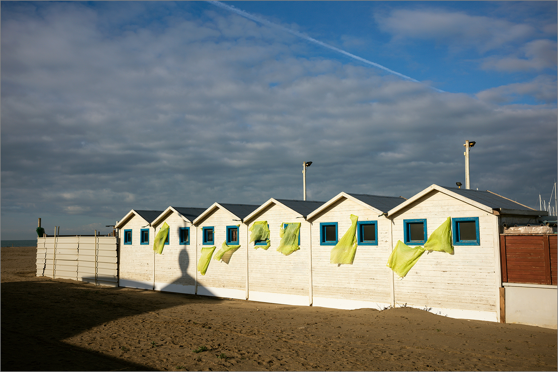 Mi piace molto l’atmosfera ventosa e il contrasto tra le facciate illuminate dal sole e il cielo che si va incupendo; bella anche la scia bianca lasciata da un aereo. Unica cosa, avrei tagliato un po’ a destra per eliminare lo steccato marrone e gli alberi retrostanti, che mi sembrano disomogenei rispetto al resto.