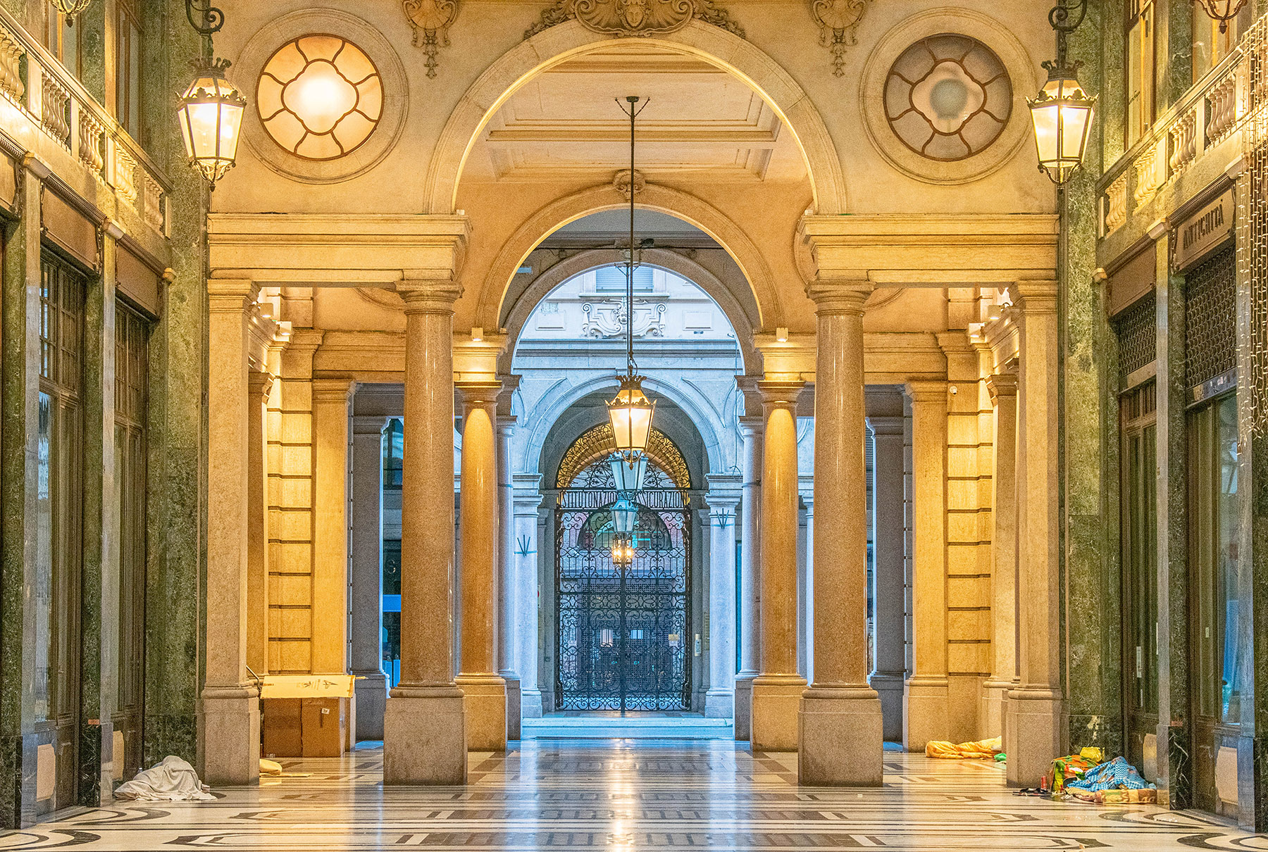 Immagino che il senso della foto stia nello sfarzo dei marmi contrapposto ai poveri cristi costretti a dormirci in mezzo. L’insegna dell’Istituto Nazionale Assicurazioni aggiunge caustica ironia alla scena...