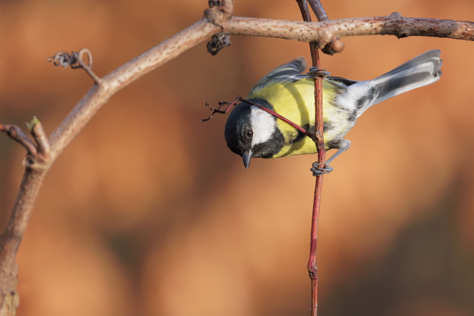 una cinciallegra acrobata ripresa molto bene nel suo esercizio