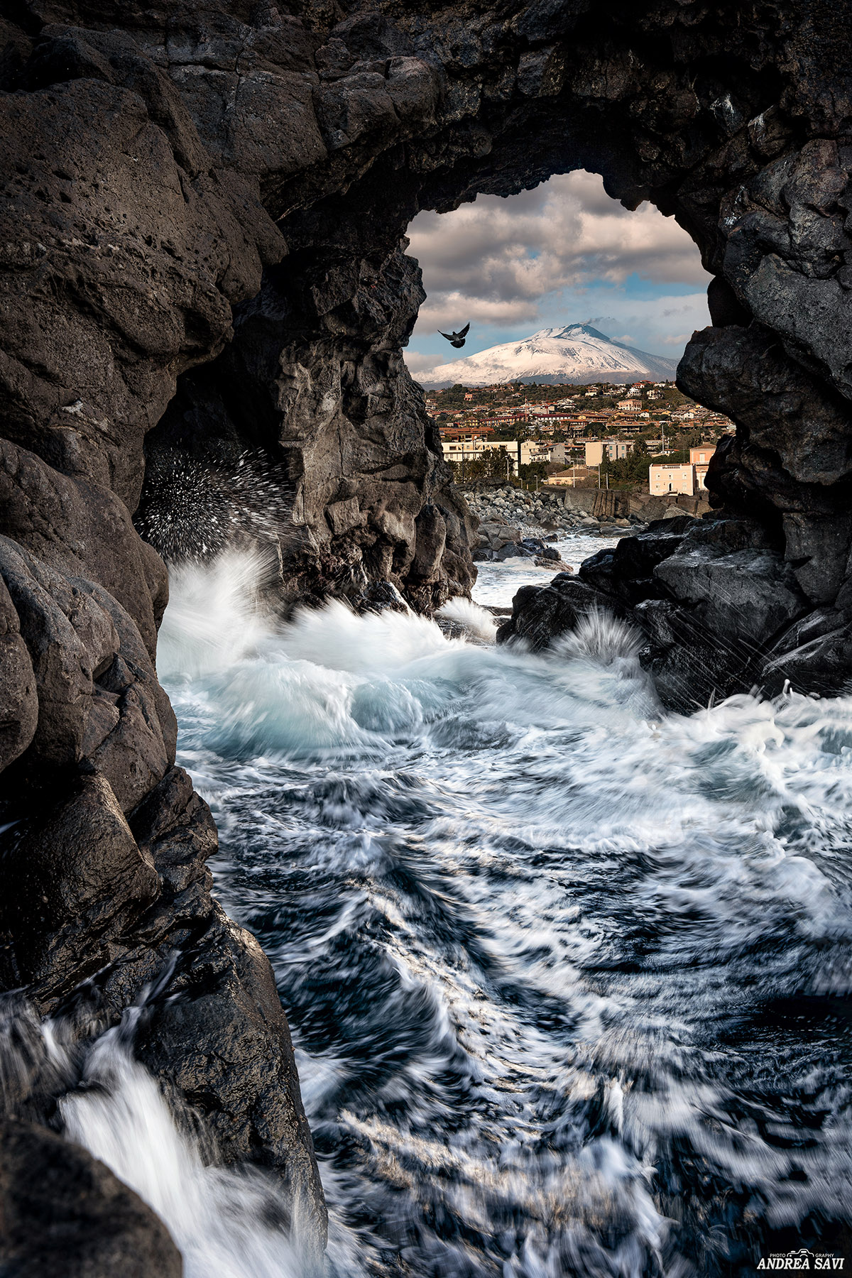 Immagine di grande profondità e dinamicità, il bianco delle onde richiama il candore della neve sull'Etna, l'uccello in volo poi...