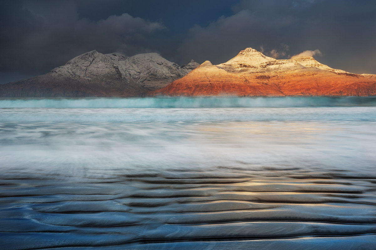 Ribatte l'oro della montagna sulla battigia, isolando il mare come fosse un elemento gassoso...
