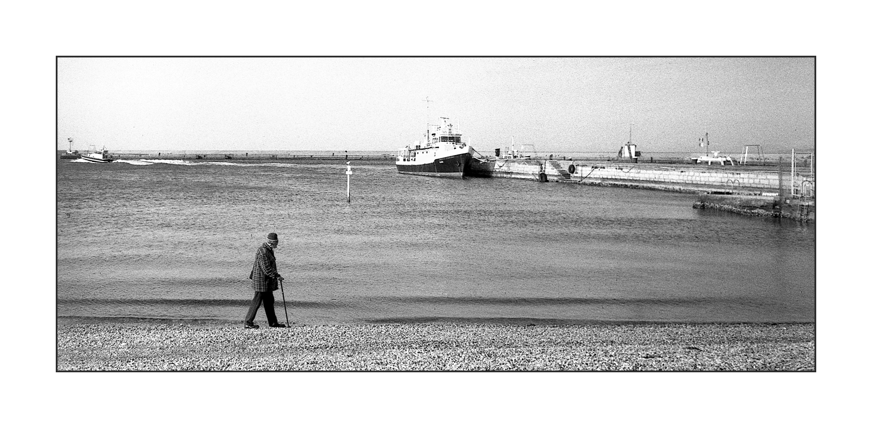 Molto bello questo racconto Sergio. La passeggiata con quel passo incerto e claudicante aiutato dal bastone. La riva del mare e i battelli attraccati al molo. Composizione perfetta ed equilibrata.