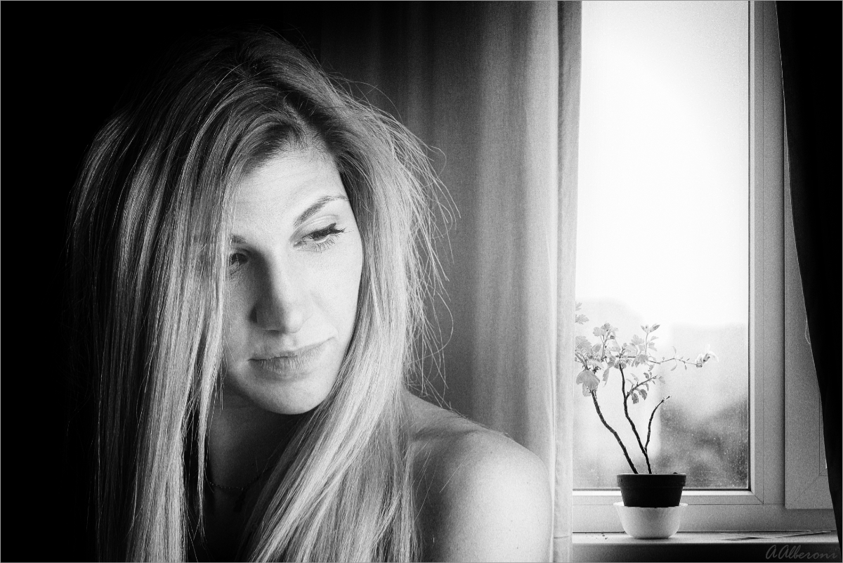 Molti gli elementi che mi colpiscono in questo ritratto... emotivamente comunicativo, discreto e intimo, uno sguardo assente, pensieroso, perso..il viso dolcemente incorniciato dai capelli morbidi,e accarezzato da una luce gentile. Il fiore presenza importante e silenziosa offre un ulteriore tocco di dolcezza,così come quella tenda bianca, a nasconderlo in parte e a farsi da parte per lasciar entrare quei raggi di luce, trovo partecipi al senso di intimità. La leggera ruvidità del bn lo rende piacevole. Uniche due cose, avrei escluso lo spicchio nero a dx e forse provato a clonare la catenina, piccole cose un po' a gusto personale, solo per un fatto di pulizia.  _________________