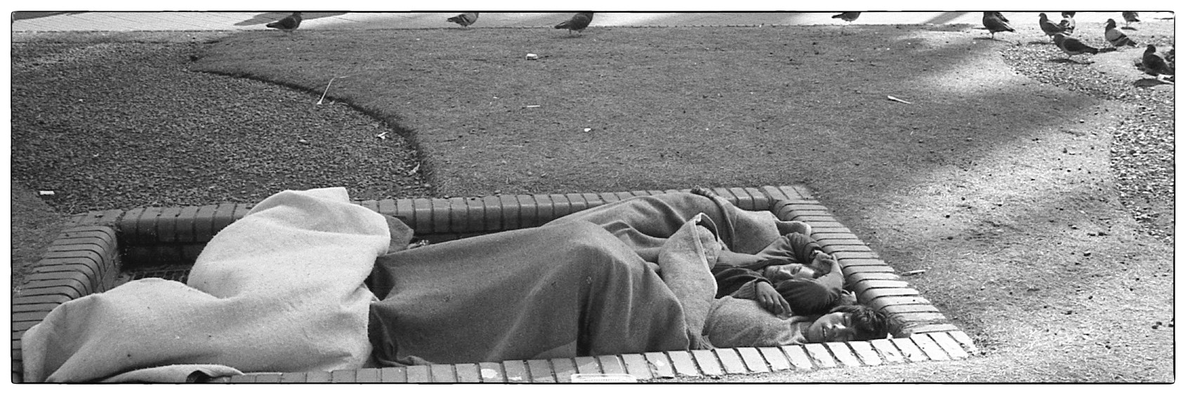 Un’immagine che colpisce… uno spazio, forse un’aiuola, trasformato in letto multiplo per senzatetto… Una scena che purtroppo vediamo spesso anche nelle nostre città, ma che ci ostiniamo a ignorare… Importante testimonianza, complimenti.