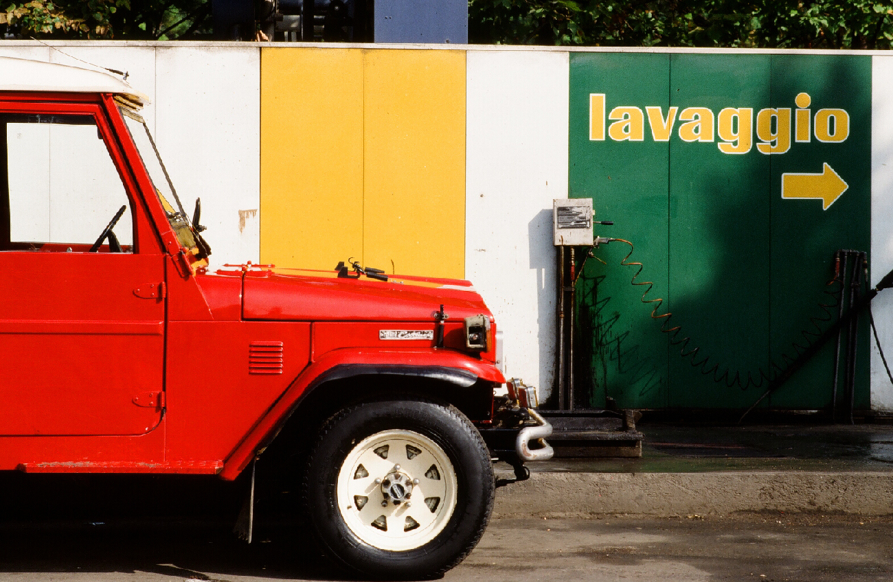 Belli gli abbinamenti cromatici. La sagoma squadrata del fuoristrada vintage si integra alla perfezione nel contesto delle geometrie del fondale. Ben vista