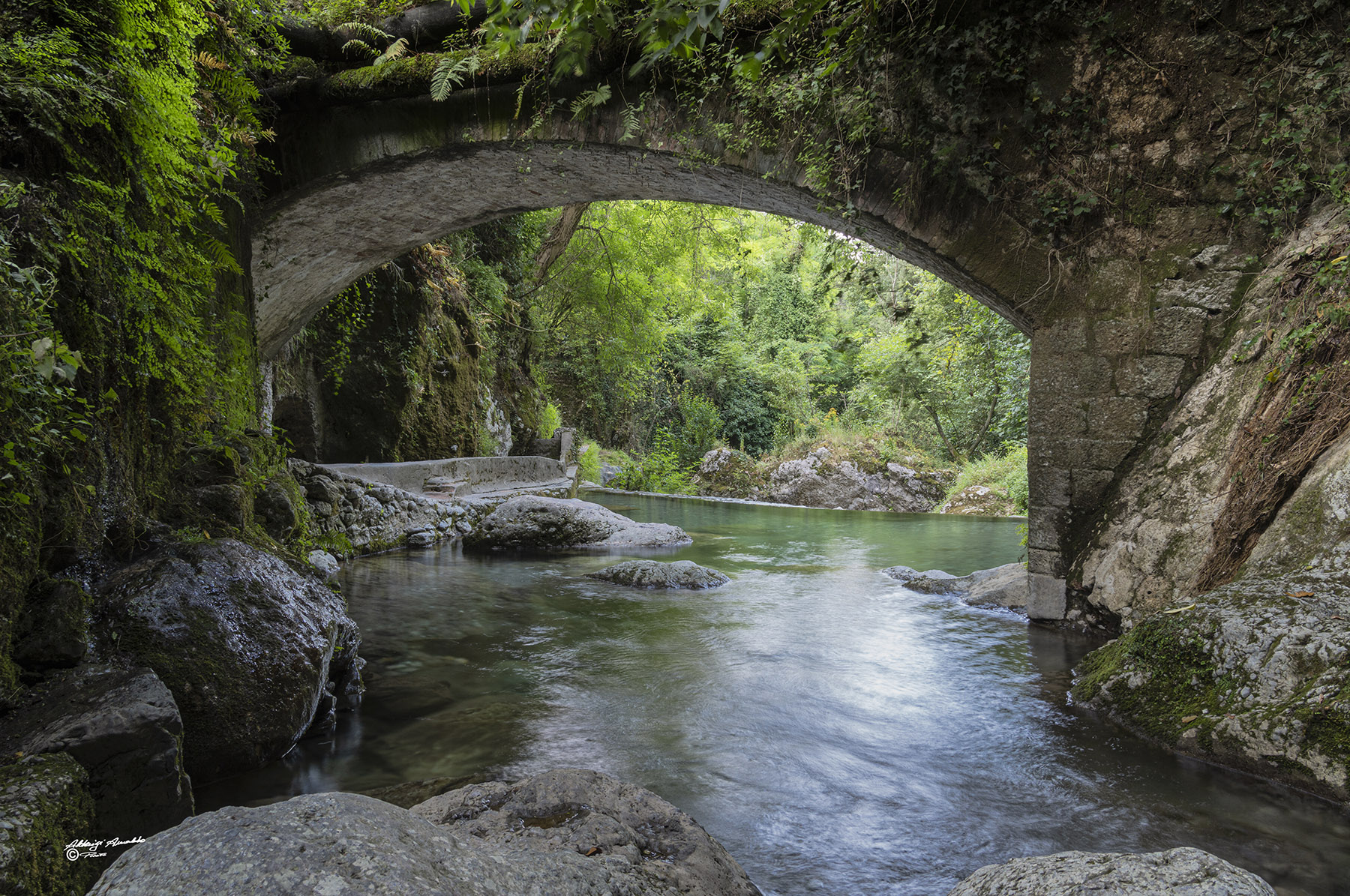 Molti belli i verdi brillanti della vegetazione che di apecchiano nel corso d'acqua ben incorniciato dall'arcata del ponticello.