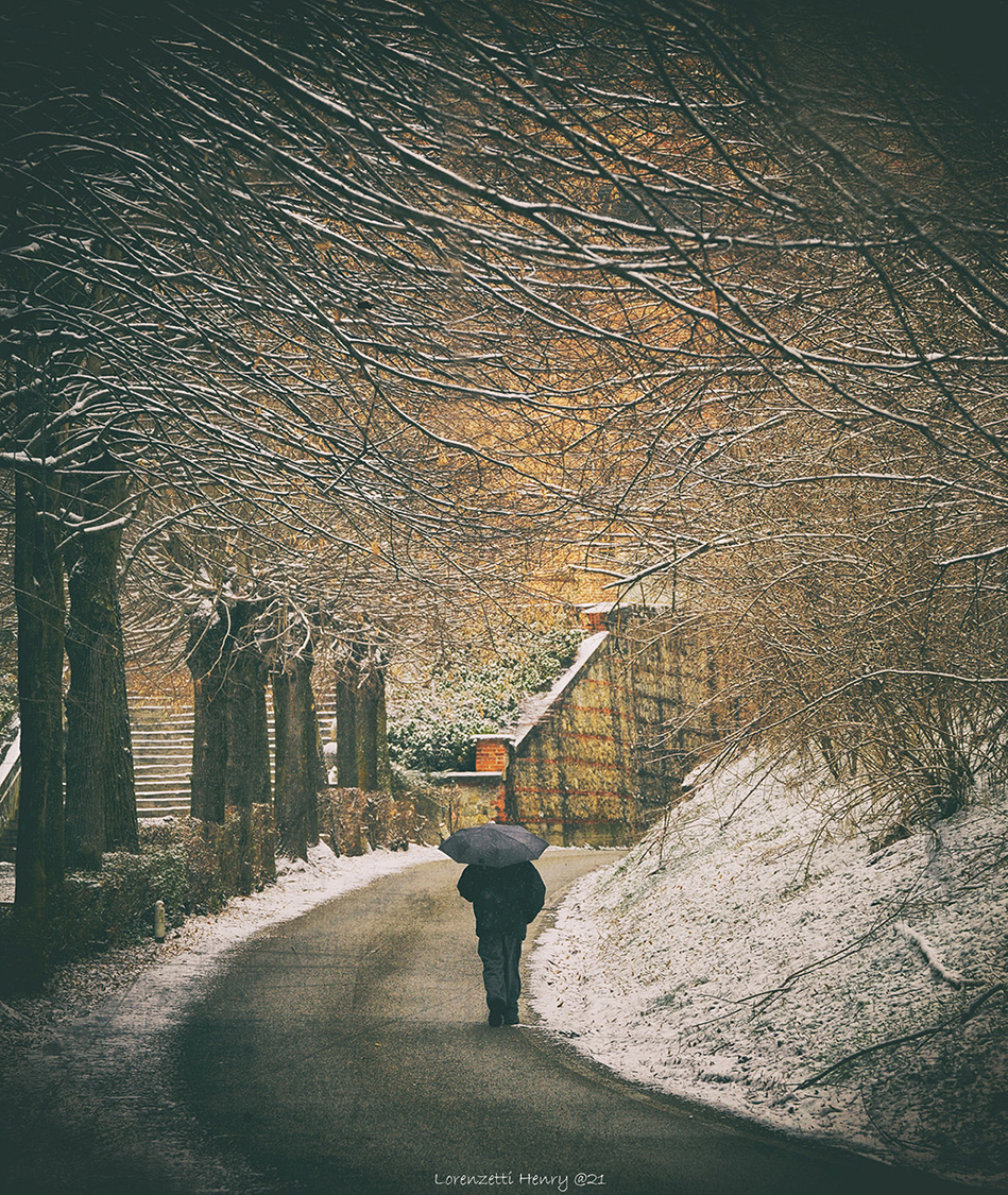 Bellissima, sembra un dipinto… Si differenzia dalle altre tue proposte con i viali innevati per il colore ambrato dello sfondo, che, scaldandola, la rende insolita… Mi piace molto